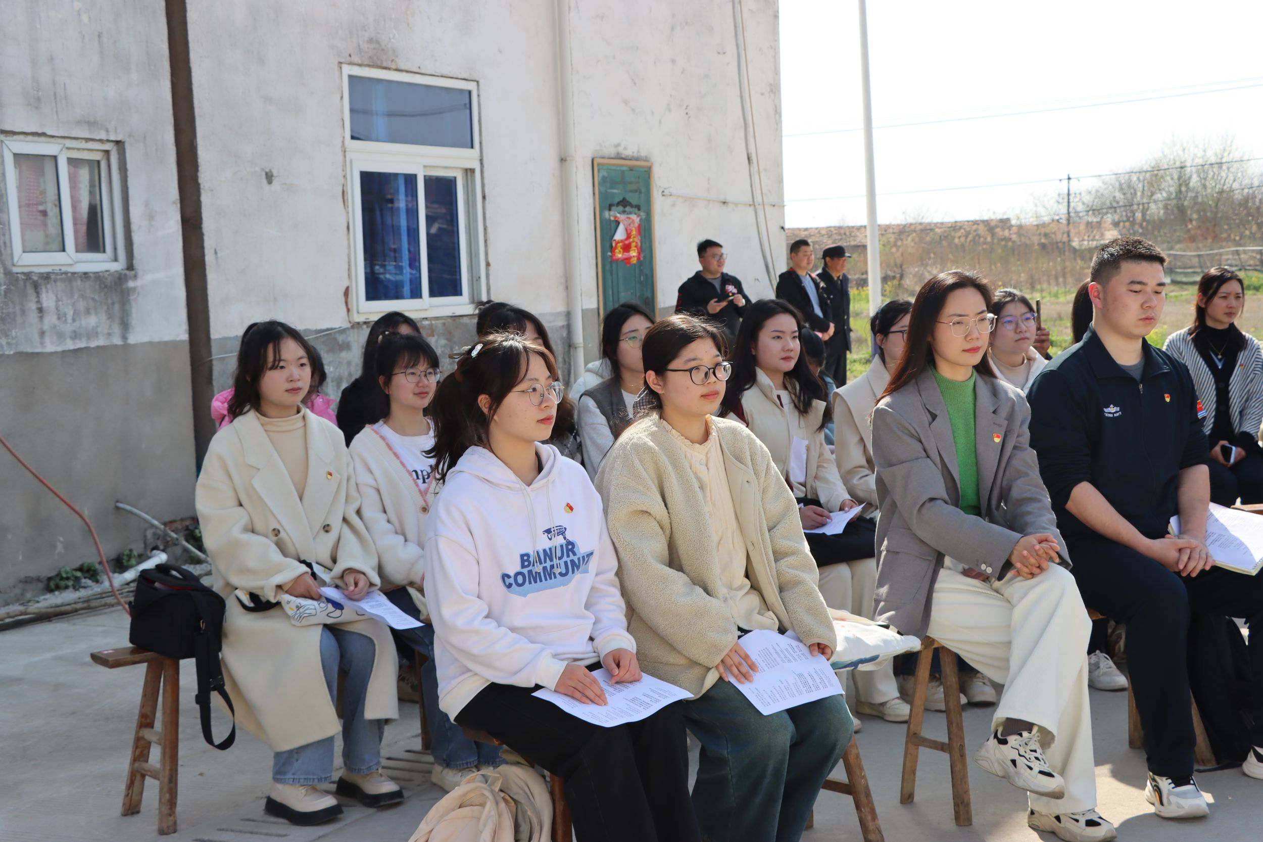 聆听百家言,寻迹发展路。活动开始,义兴村老书记钱万银就乡村发展作经验交流。钱老书记以一名老党员的身份先是给同学们上了一堂接地气的党史教育课,以质朴语言讲述初心与使命;紧接着为大家介绍了近年来义兴村的发展建设成果:高标准农田建设如火如荼、老旧设施更换稳步推进,一幅宜居宜业的和美乡村画卷正在铺就。