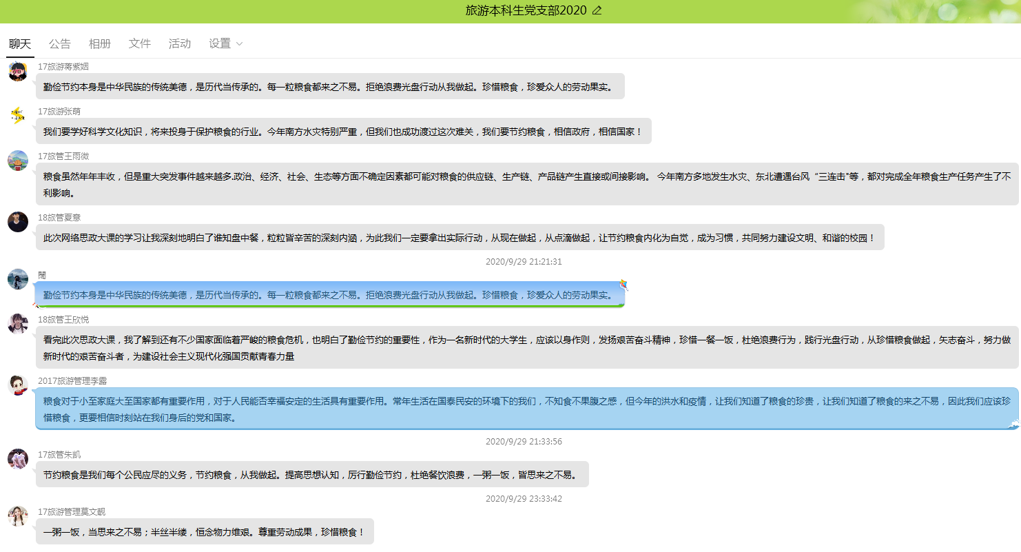 旅游本科生党支部入党积极分子、2018级旅游管理本科生 王欣悦:看完此次思政大课,我了解到还有不少国家面临着严峻的粮食危机,也明白了勤俭节约的重要性,作为一名新时代的大学生,应该以身作则,发扬艰苦奋斗精神,珍惜一餐一饭,杜绝浪费行为,践行光盘行动,从珍惜粮食做起,矢志奋斗,努力做新时代的艰苦奋斗者,为建设社会主义现代化强国贡献青春力量!