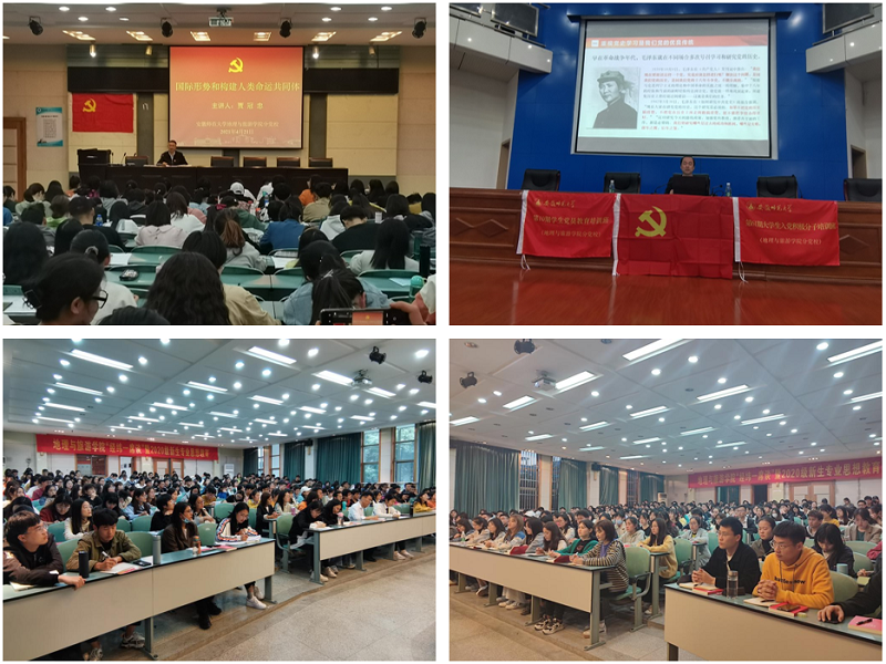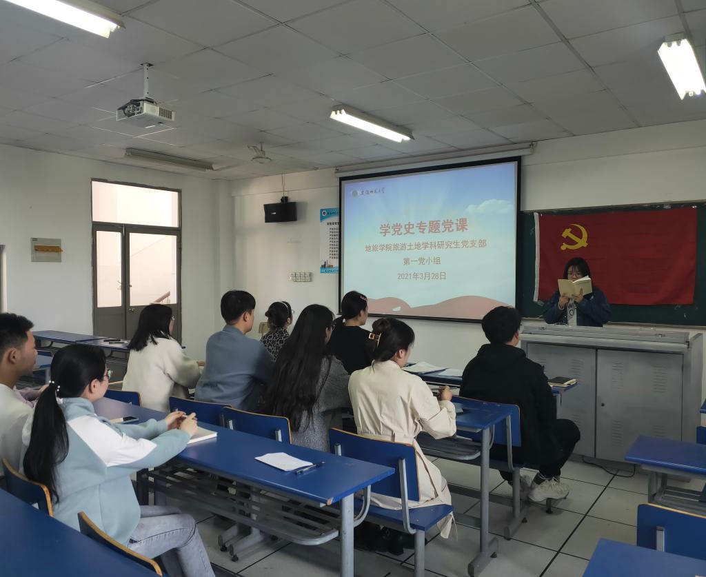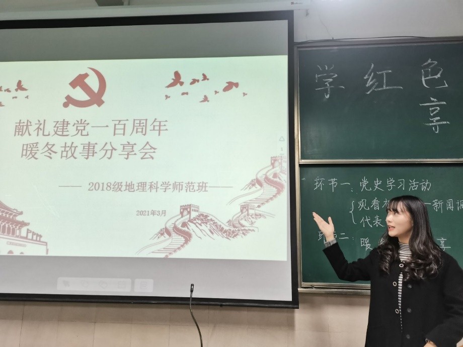 各班级也开展了形式多样的党史学习教育主题班会。2020级城乡规划和土地资源管理专业开展组织党史知识竞赛,使党史学习教育进头脑;如2020级地科1班同学们齐唱《勘探队员之歌》,在激昂的旋律中体会作为地理人所将肩负的责;地科4班的同学们通过学习中国共产党党史、学习习近平总书记重要讲话、观看献礼纪录片等,加深了对当前党情世情的了解,更加坚定了共产主义信仰;20级旅游管理专业召开 “学党史”主题班会,辅导员领学《论中国共产党历史》的主要内容,要求同学们要将学习党史内化于心、外化于行;2018级地理科学(师范)举办“学红色党史,享暖冬故事”主题班会。