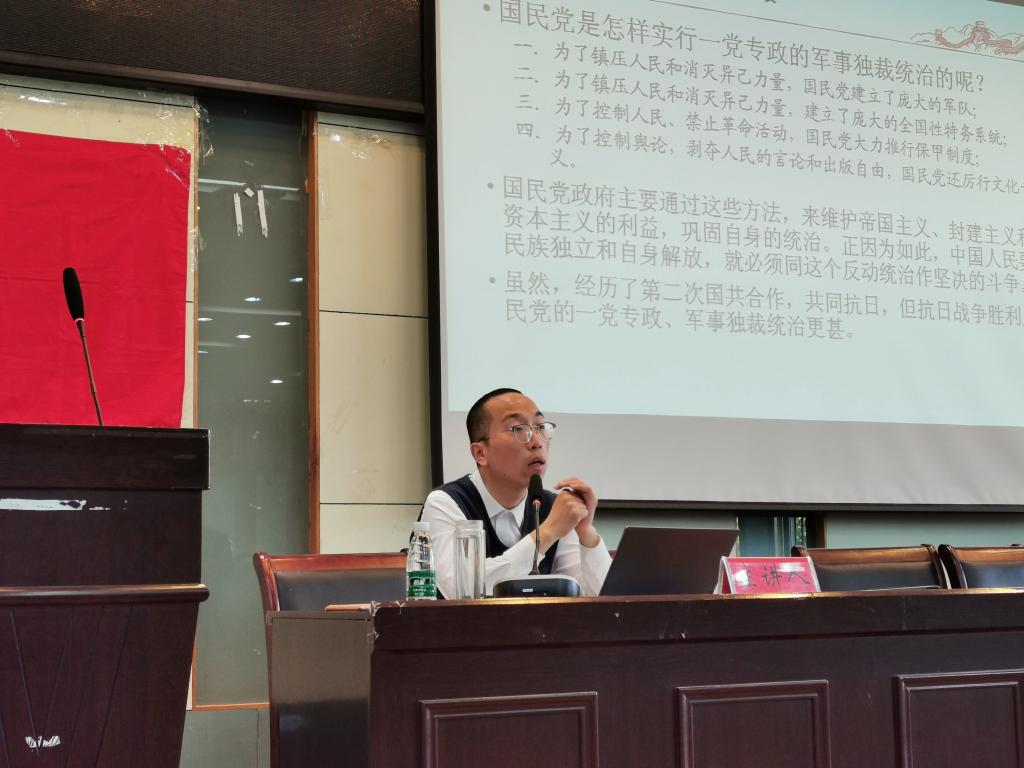 王瀛培从国民党建政与执政失败(革命对象)、中间势力的建国方案及其破产(朋友) 、中国共产党执政地位的确立(自己)、中国共产党从革命到执政的历史必然性四个展开授课。从中国同盟会开始介绍国民党的建立发展,指出国民党失败的原因是国民党独裁内战违民意,共产党民主和平顺民心;国民党贪污腐化,共产党清正廉洁;国民党横征暴敛,共产党一心为民。中间势力明大势,顺时势,毅然选择支持和拥护中国共产党的领导,为中国共产党实现由革命到执政提供了必要的政治支持和社会基础。从中国共产党的理想追求,中国革命新道路的探索,抗日战争的中流砥柱,多党合作与各党派协商建国,四个方面介绍中国共产党执政地位的确立。王瀛培全讲贯穿中国共产党领导是历史的必然性,号召同学们其不断加深理论学习,朝着中国特色社会主义方向不断前进。