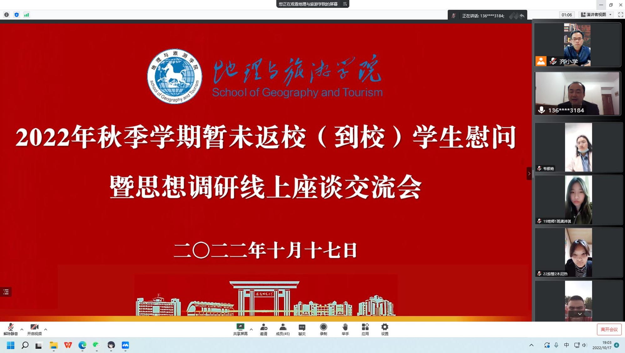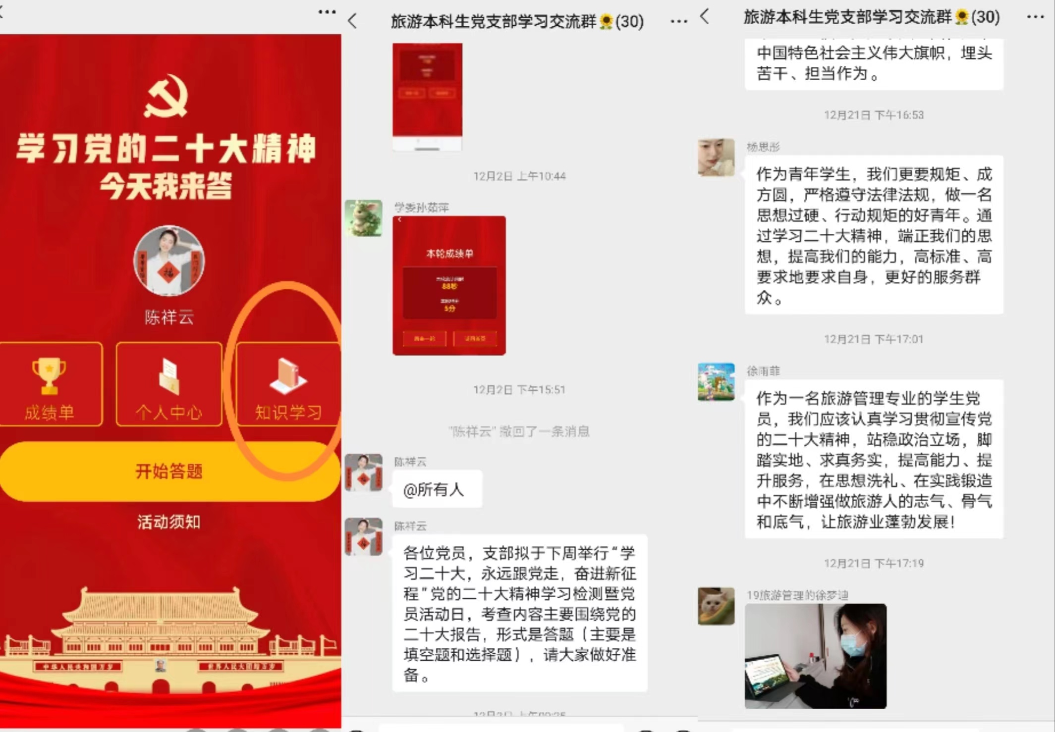 紧扣主题,开展多形式、分层次、全覆盖的全员学习培训。组织党委班子成员、教职工党支部、学生党支部、班级团支部等各群体党员和青年团员集中收听收看党的二十大开幕会,第一时间学习领会会议精神。持续完善“班子领学、全员共学、个人自学、分享互学、以行践学”制度体系,将党的二十大精神有关内容纳入党委、党支部理论学习重要内容,开展“学习二十大、永远跟党走、奋进新征程”专题学习会。党委班子成员指导所在和联系支部带头宣讲党的二十大精神,带头参加学习,带头讨论交流。院党委书记贾冠忠带领全体教职工专题学习党的二十大精神,要求全体教职工要提高政治站位,以党的二十大精神为指引,推进学院“两个振兴行动计划”落地见效;院长方凤满结合党的二十大精神和学校“两大振兴行动计划”解读《地理学学科振兴行动计划实施方案》,提出培养一流地理学科人才,高质量服务国家和区域经济社会发展的目标;学院副书记乔静带领学院团委委员、学生会全体成员、各班级学生骨干集中学习党的二十大有关精神和“两大振兴行动计划”;全国党建工作样板党支部(旅游本科生党支部)通过专题学习、在线答题、感悟分享、学习问答等方式激励学生党员学好党的二十大精神;各班级团支部全员开展“学习二十大”主题团日活动、在线收看学习宣传贯彻党的二十大精神专场宣讲报告会……确保广大师生进一步吃透精神实质,把握核心要义,并在讨论交流中进一步提高站位,强化认识。