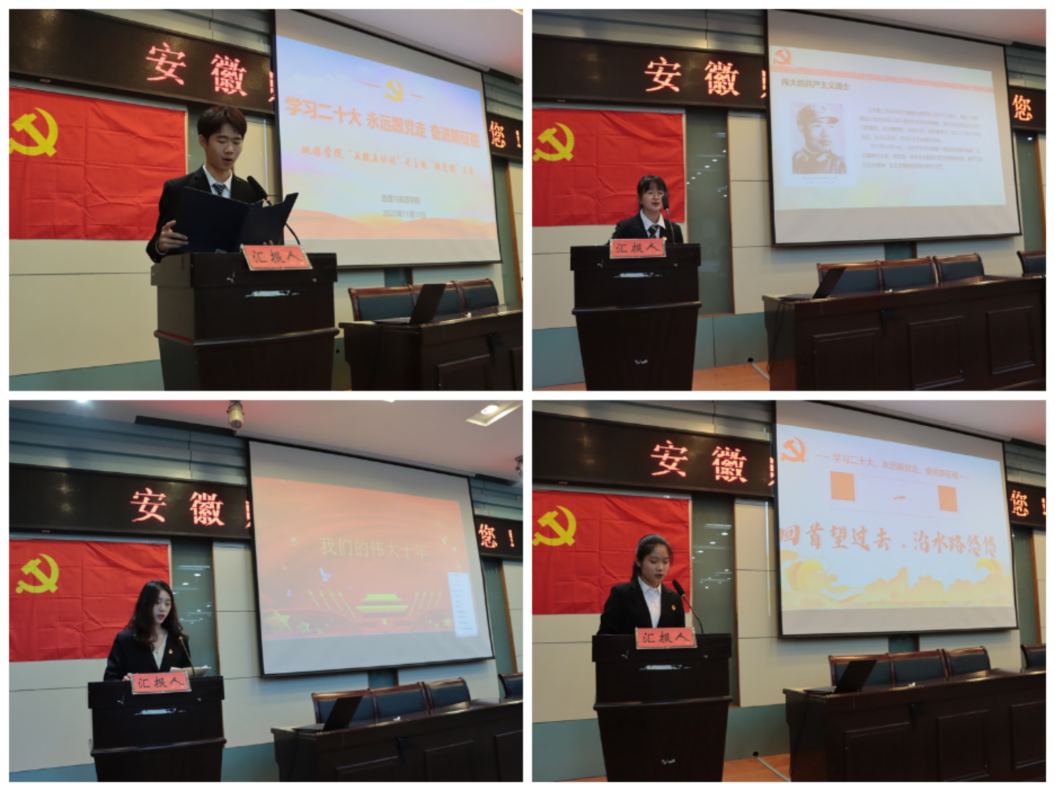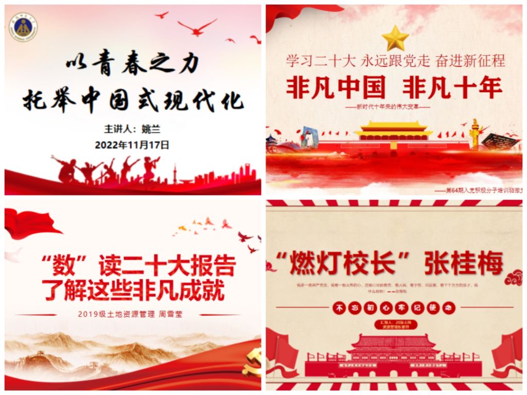掀起学习宣传贯彻党的二十大精神的热潮。一是学习做到多层次、全覆盖。在党委带领下采取会议专题学、教职工大会集中学、支部大会学、在线收看学、个人自主学等各类学习会议50余场,做到师生全员参与。二是打造多样化宣讲队伍。全方位、多角度宣传解读党的二十大精神,党委班子带头讲,重在精神鼓舞和思想启迪;专家学者深入讲,聚焦理论深度和重点维度;先锋模范讲示范,聚焦真理之光和青年之责,共计形成专题党课和微党课课件、讲稿250余份,红歌传唱视频10余部。三是创建常态化宣讲载体。将宣讲融入党团活动环节,引导讨论交流;将宣讲融入专业实习,打造行走的思政课堂;注重线上云端宣讲,打破传播瓶颈,拓展宣讲辐射群体。四是擦亮特色品牌、发挥典型示范。做实做新新时代高校党建“双创”全国党建工作样板支部创建示范、“五微五计划”、“送党课到实习点(实践地)”等学生党建品牌活动,将党性锻炼与素质拓展相结合、将理论学习与社会实践相结合,确保党员教育管理成效;持续推进“团结花开”少数民族学生联系培养关怀教育工程,首位参军入伍的在校维吾尔族大学生阿卜来提·阿卜力克木获校第18届“师大骄子”十佳大学生标兵、教育部大学生就业创业典型人物事迹表彰以及安徽省2023年“十佳”“百优”大学生推荐;发挥“榜样的力量”,开展“地旅风华”典型引路育人项目暨“百瑞德风华奖学金”评选,在学生群体中形成创先争优、示范引领良好氛围;在疫情防控政策调整关键期,22位党员教职工积极响应党委号召,在关键时刻克服困难、迎难而上,全力保障2023年全国硕士研究生招生考试考务工作,以实际行动践行党的二十大精神。