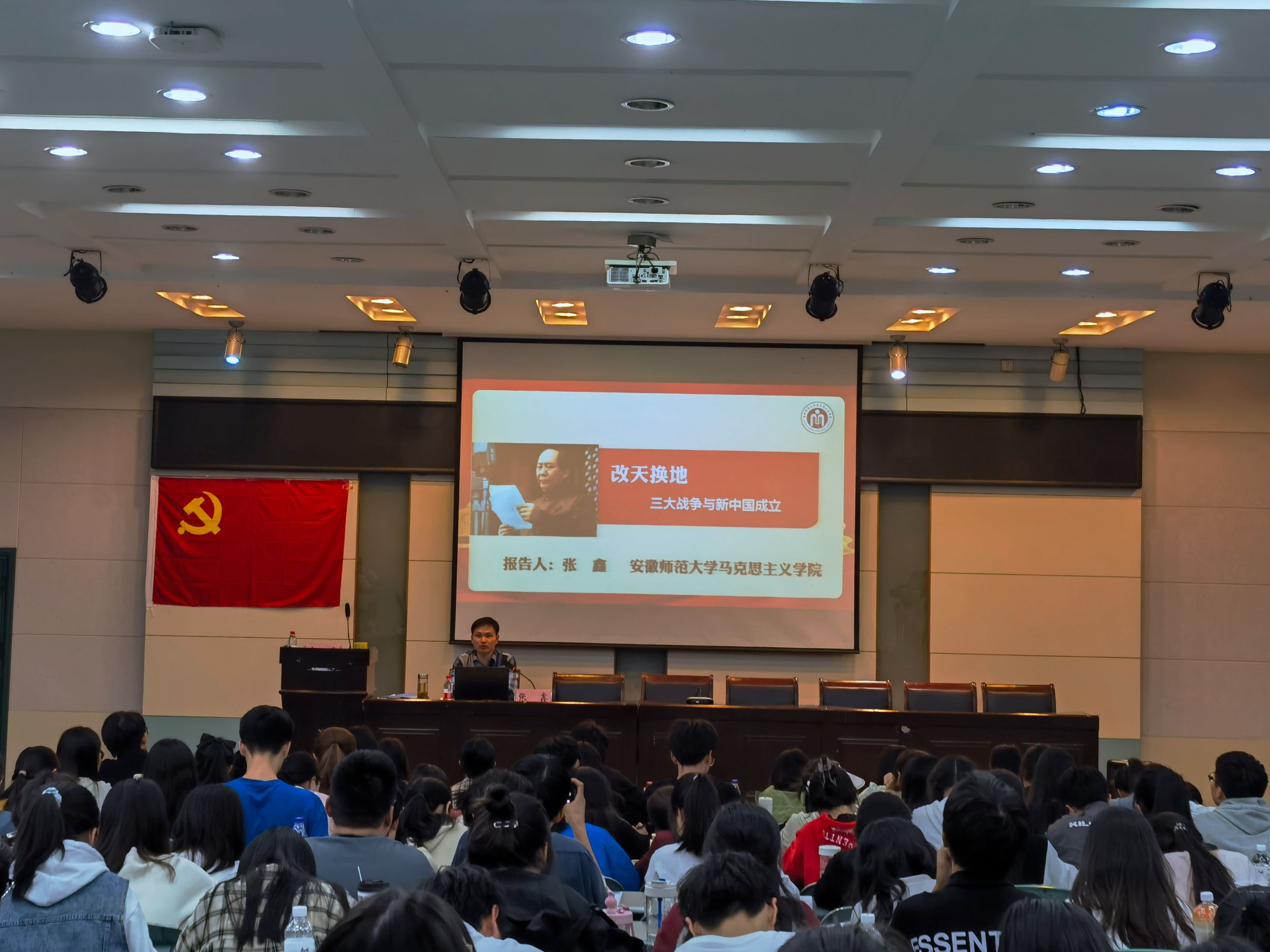 马克思主义学院副教授张鑫作《改天换地:三大战争与新中国成立》主题授课。他主要围绕“护国之战——全民族抗日战争”、“开国之战——全民族解放战争”和“立国之战——抗美援朝战争”展开,讲述了三大战争的经过和历史意义,重点论述了中华人民共和国成立的伟大意义。他强调,经济和科技实力为基础的综合国力对一个国家影响力的重要作用,寄语同学们积极投身到社会主义现代化建设中去,为祖国繁荣富强贡献出自己的一份力量!