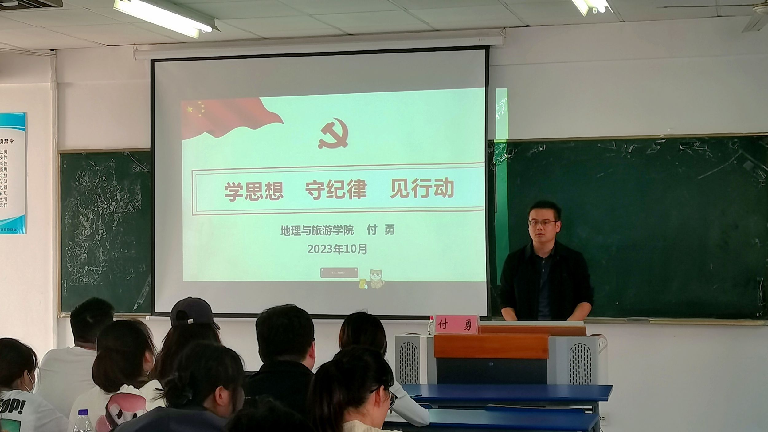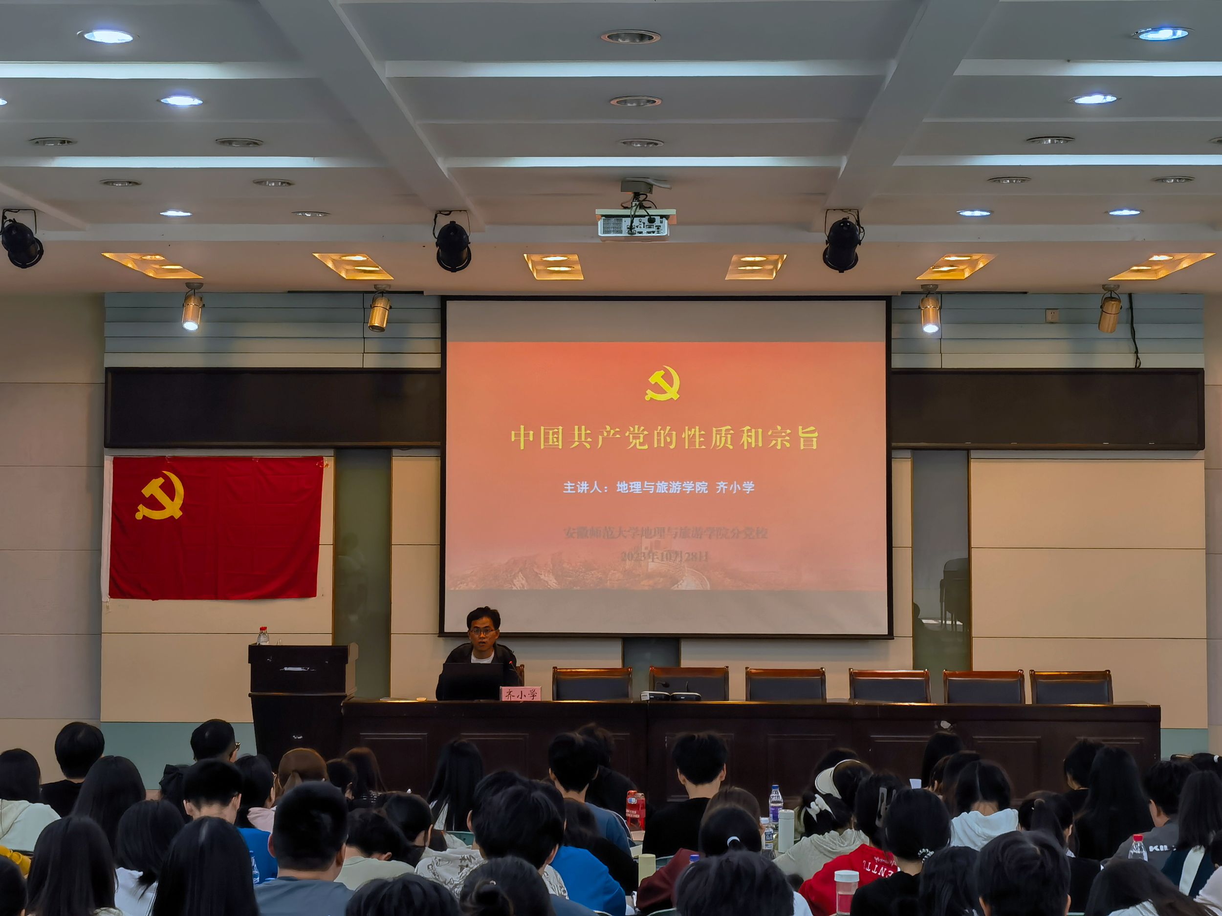 地理科学专业本科生第一党支部书记齐小学作题为《中国共产党的性质与宗旨》专题讲座,他围绕“中国共产党是什么”“中国共产党要干什么”,从中国共产党的诞生、全心全意为人民服务、坚定理想信念三方面进行详细解读,用真实事例讲解党史和理论知识,并号召全体学员立大志、明大德、成大才、担大任,以实际行动把握人生方向、擦亮青春底色、练就过硬本领、肩负历史使命。