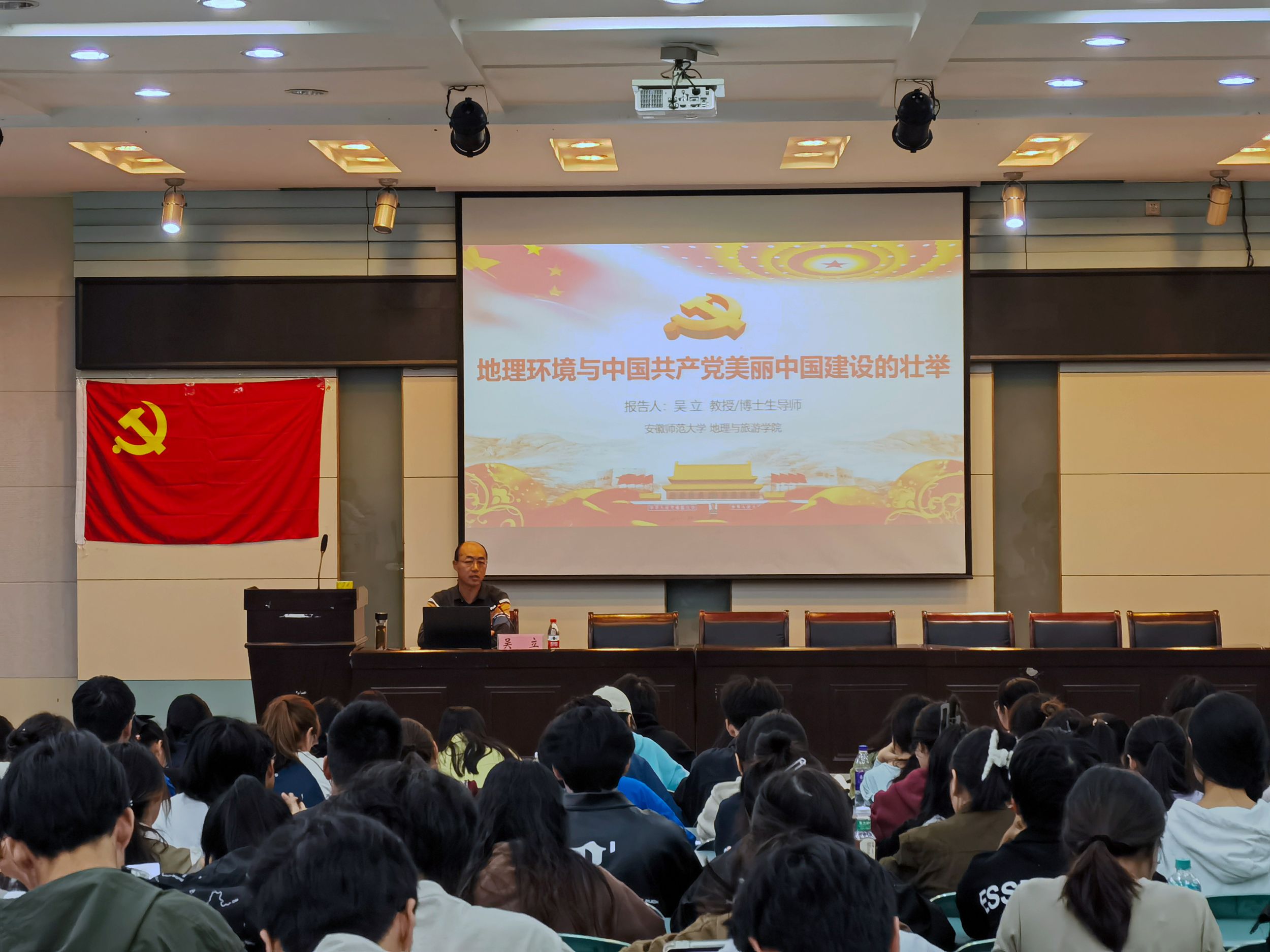 江淮流域地表过程与区域响应安徽省重点实验室副主任、安徽省地理学会秘书长、博士生导师、教授吴立结合专业特色与研究成果,作了题为《地理环境与中国共产党美丽中国建设的壮举》专题讲座。他立足历史唯物主义视角,从“巢湖生态修复”到“人与自然的关系”,和学员们共同探讨应该如何看待地理环境。最后,他以中国共产党如何对待自然环境为切入点,列举了美丽中国建设的重大战略思想和举措,并结合南泥湾、红旗渠、毛乌素沙地治理等实例,深入浅出地向同学们阐述了中国共产党在美丽中国建设的重要引领作用,并寄语同学们要在美丽中国建设中充分发挥先锋模范作用。