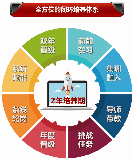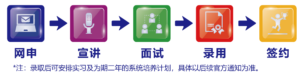 网申校园宣讲—面试—发放录取通知(注:录取后将进行实习安排和为期二年的培养计划,具体以后续通知为准。)