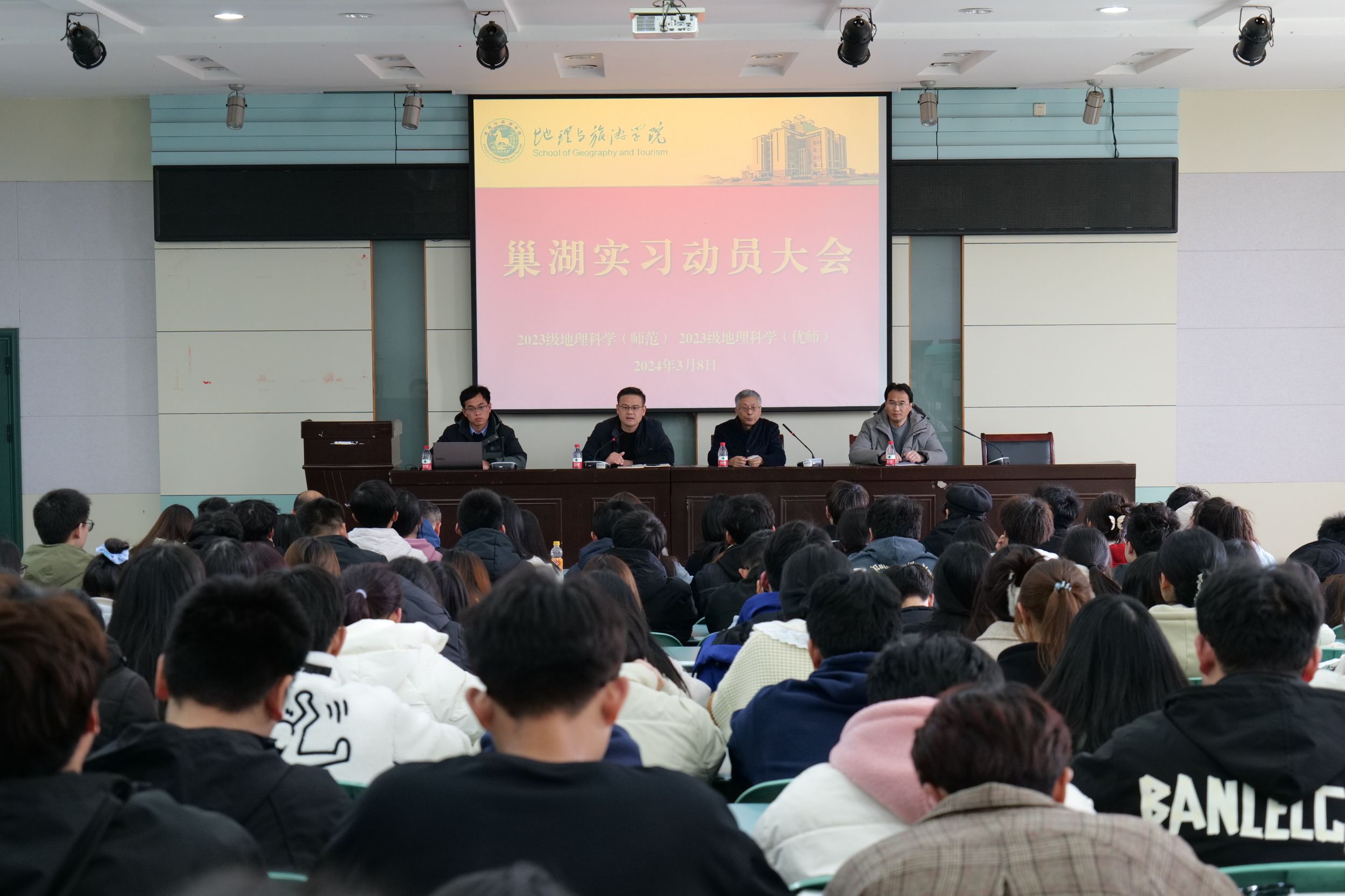 在学院实验楼101报告厅举行巢湖实习动员大会,学院党委副书记付勇,副院长杨兴柱,实习指导教师程先富、吴立、杨立辉、朱晓强以及2023级地理科学(师范)、2023级地理科学(优师)专业全体同学参加会议。会议由辅导员齐小学主持。