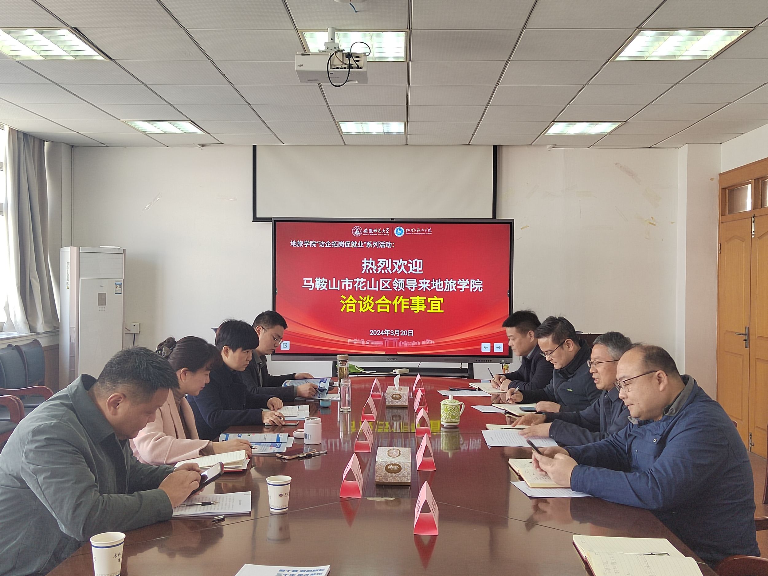 与马鞍山市花山区在学院四楼会议室举行政校合作交流会。马鞍山市花山区区委副书记、濮塘休闲度假区管委会党工委书记、主任丁巨凤,花山区人社局局长孙娟,花山区文旅体局局长袁晓明,花山区濮塘镇党委委员王秋翔,番茄小说