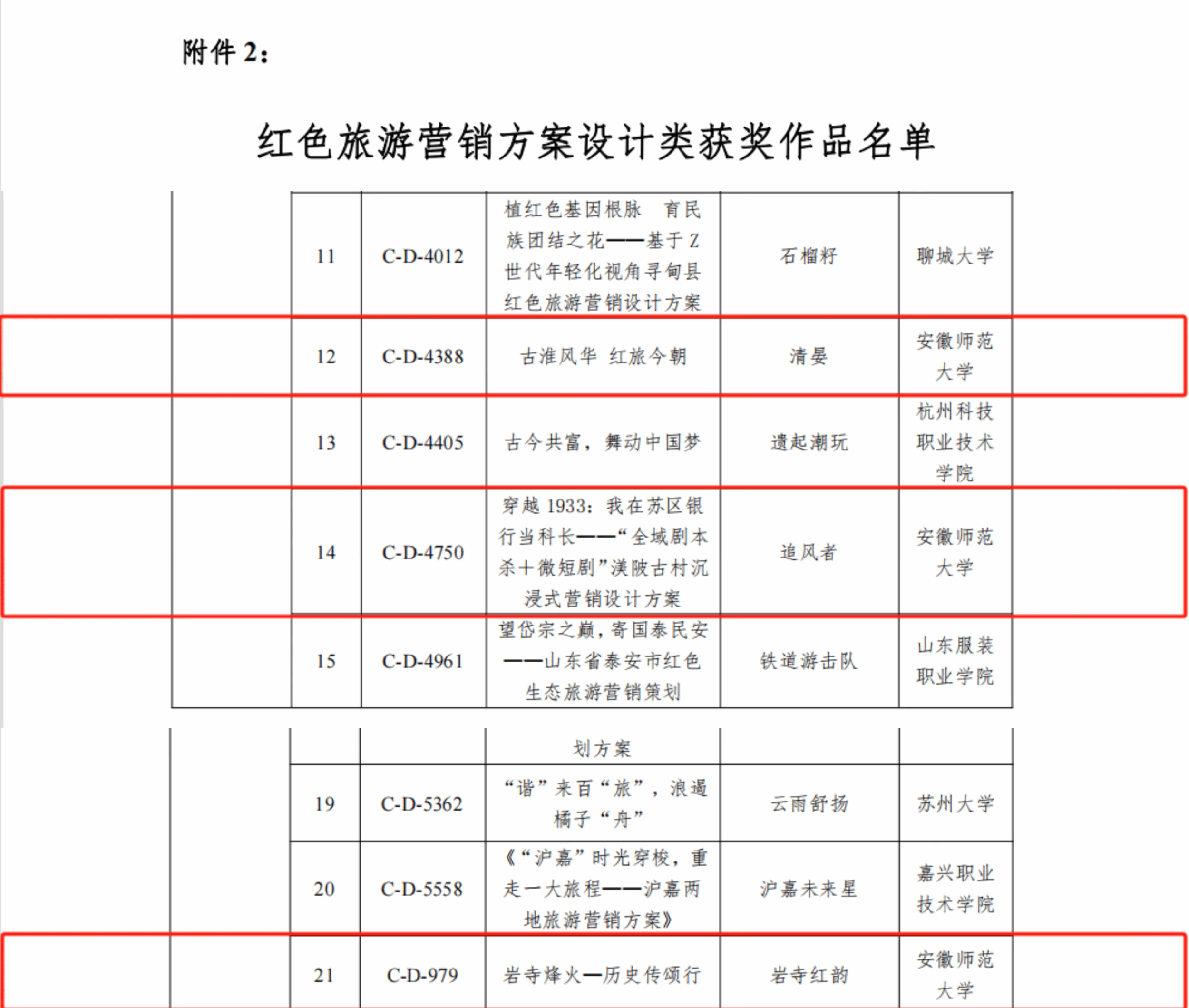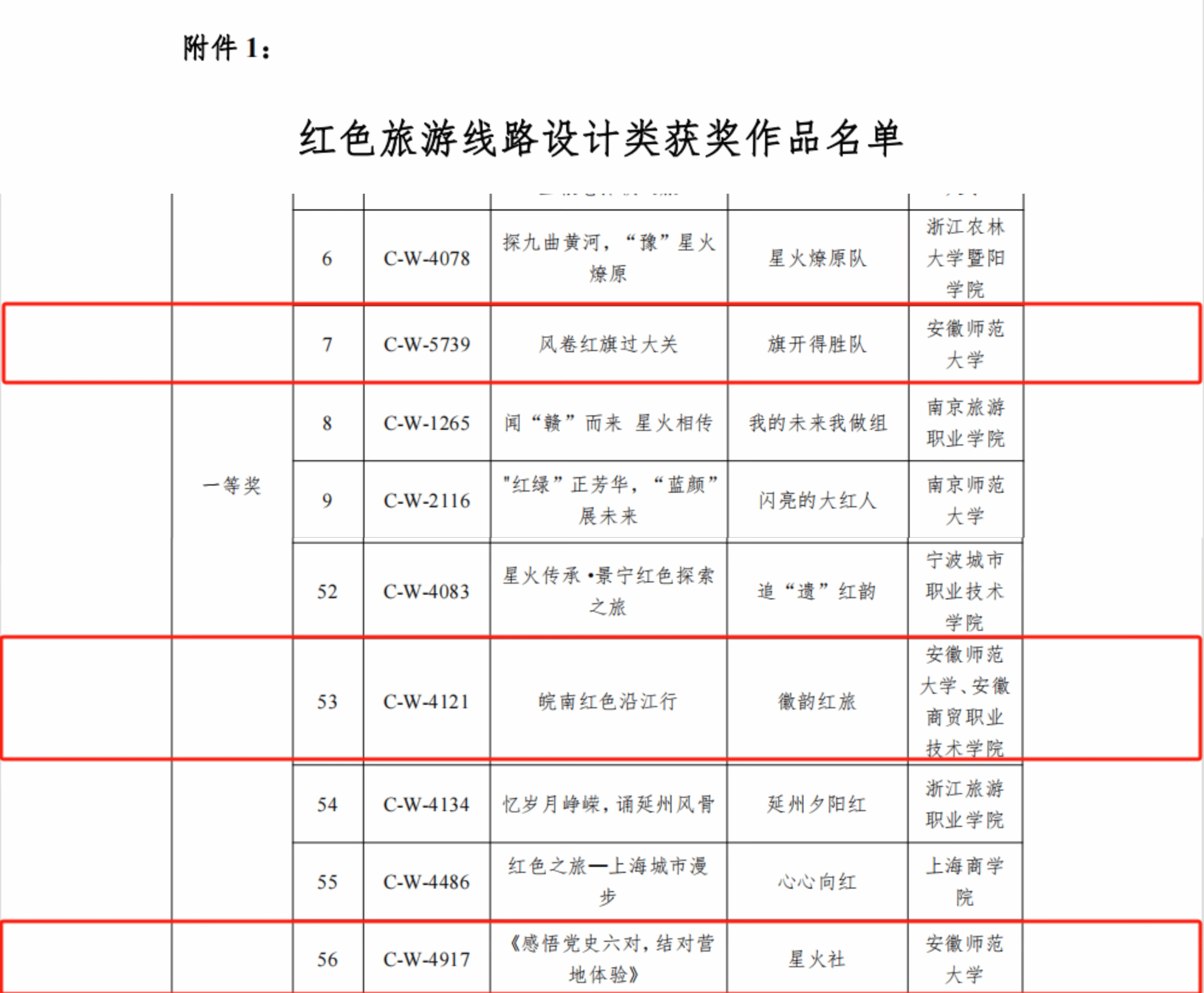 3支队伍斩获“红色旅游线路设计类作品”华东赛区一等奖,3支队伍斩获“红色旅游营销方案设计类作品”华东赛区一等奖,1支队伍斩获“红色旅游线路设计类作品”华东赛区二等奖。