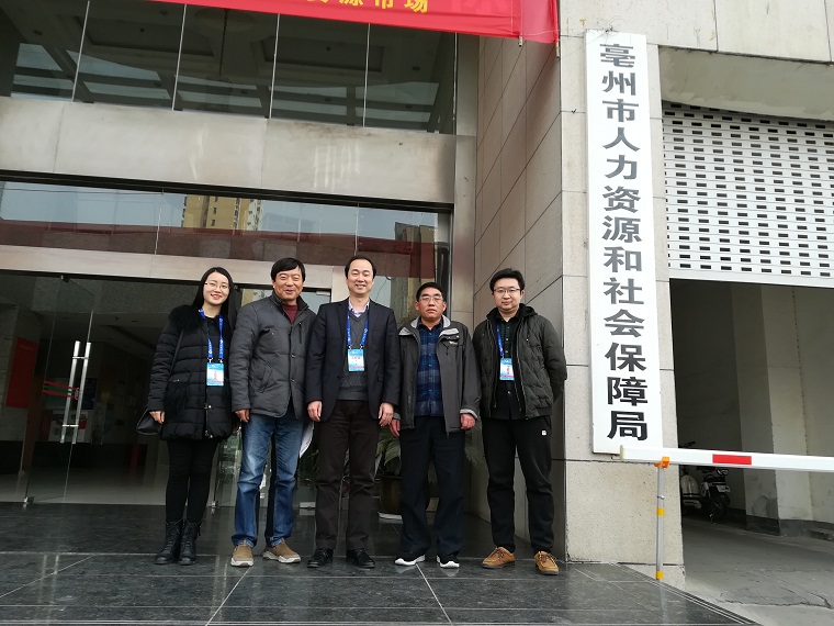 党委副书记乔静带领辅导员钱程、彭媛媛赴亳州市人力资源和社会保障局开展“校政企”合作洽谈。亳州市就业局副局长李万夫、市人社局就业科科长耿汉杰、市就业局市场科科长刘永等对我校的拜访表示热烈的欢迎。