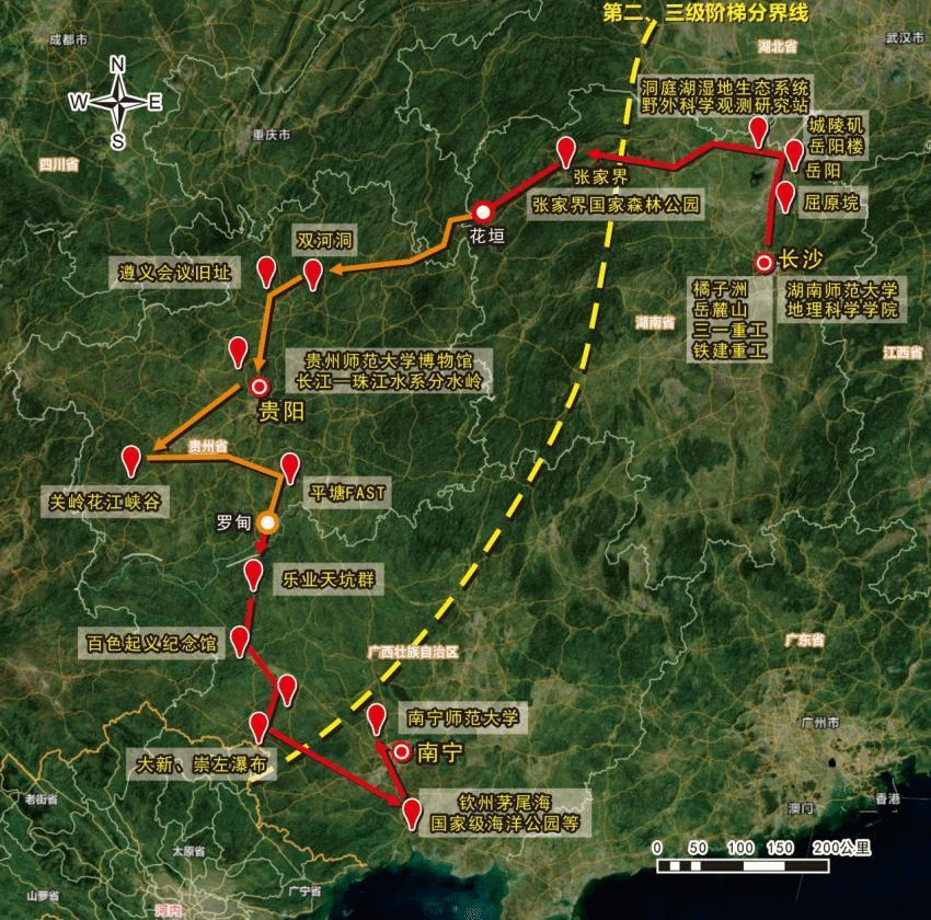 本次联合实习为期16天,先后跨越湖南、贵州和广西三省(自治区),行程超过2500公里。其中,湖南段从长沙出发,先后途经洞庭湖区、张家界到花垣,重点考察了长沙的山水洲城格局、洞庭湖区的复杂人地关系、张家界地貌的形成演化等;贵州段从湄潭开始,先后途经遵义、贵阳到罗甸,重点考察了湄潭县茶产业发展与乡村振兴、岩溶地貌与石漠化治理、西南少数民族文化等;广西段从乐业开始,先后途经百色、钦州到南宁,重点考察了百色旧石器古人类遗址、北部湾沿海红树林生态系统、防城港港口建设与海洋牧场等。在实习过程中,全体实习师生还先后参观了遵义会议会址、百色起义纪念馆等极具历史意义的革命纪念地,通过亲身体验和学习,深刻感受了革命先烈的事迹、红色文化的熏陶和革命精神的传承。