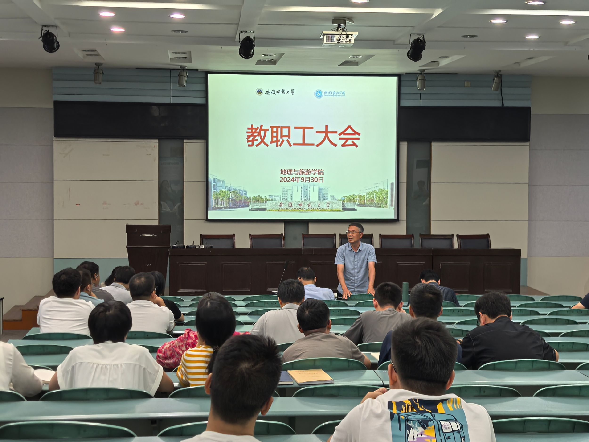 在实验楼101报告厅召开全院教职工大会。专题学习党的二十届三中全会精神,传达学习全国教育大会精神,布置近期重点工作。学院全体教职工参加会议,会议由院长方凤满主持。