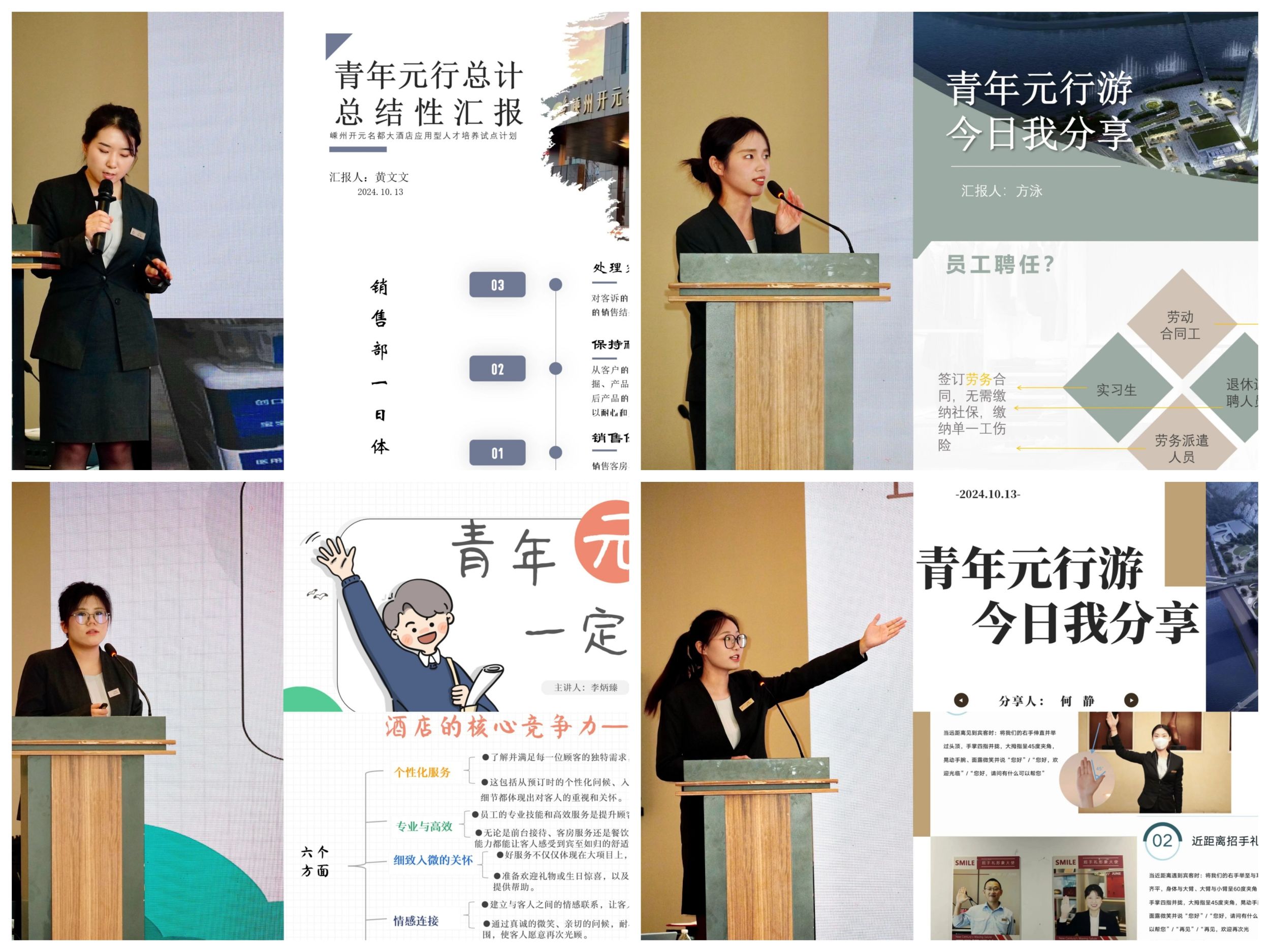 与嵊州开元名都大酒店合作探索促进毕业班职业体验和和能力提升举措,经过前期的座谈交流和系统谋划,10月10-13日,学院5名毕业生代表在嵊州开元名都大酒店参加“开始吧,青年元行”人才培养创新实践,在企业高管的带教下,同学们以宾客视角、员工视角、管理视角开展一系列体验活动,并结合专业提出对岗位的思考感悟。期间,学院党委副书记付勇、旅游管理专业负责人尹寿兵、毕业班辅导员韦银艳一同前往嵊州关心慰问实践学生。