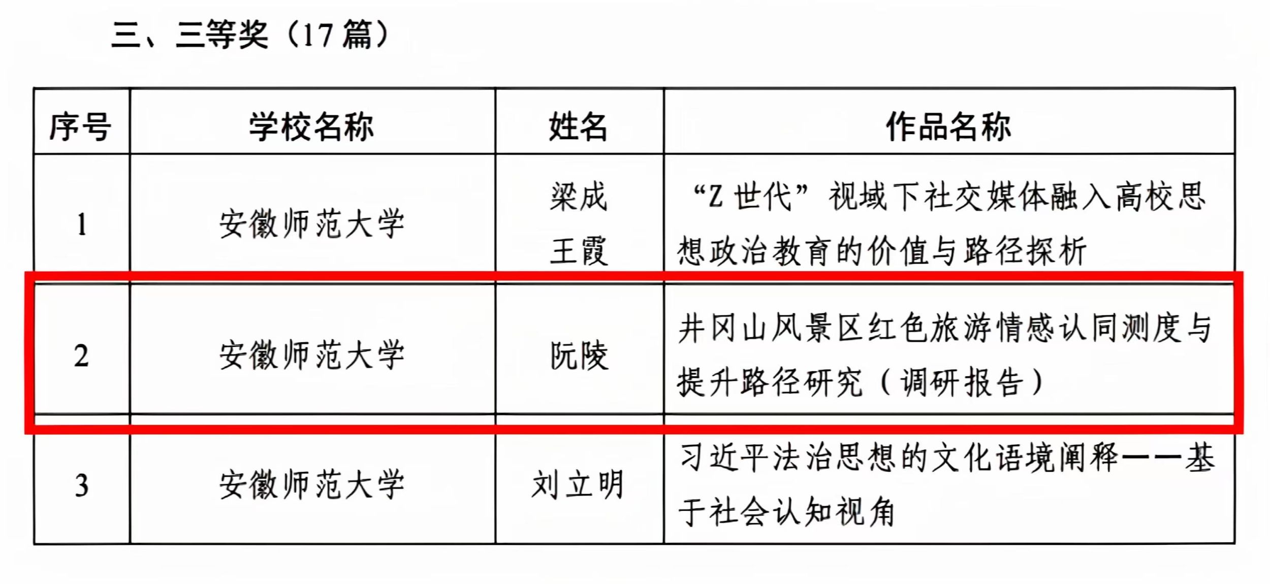 喜获佳绩,分别荣获三等奖1项、优秀奖3项。其中,阮陵老师的《井冈山风景区红色旅游情感认同测度与提升路径研究》荣获三等奖;余健老师的《以习近平新时代中国特色社会主义思想为引领,推动高校思想政治工作高质量发展》、周迎秋老师的《脚踏实地,做德才兼备的地理人》和王雪微老师的《高校专业课程思政建设问题与解决路径探究——以交通规划为例》荣获优秀奖。