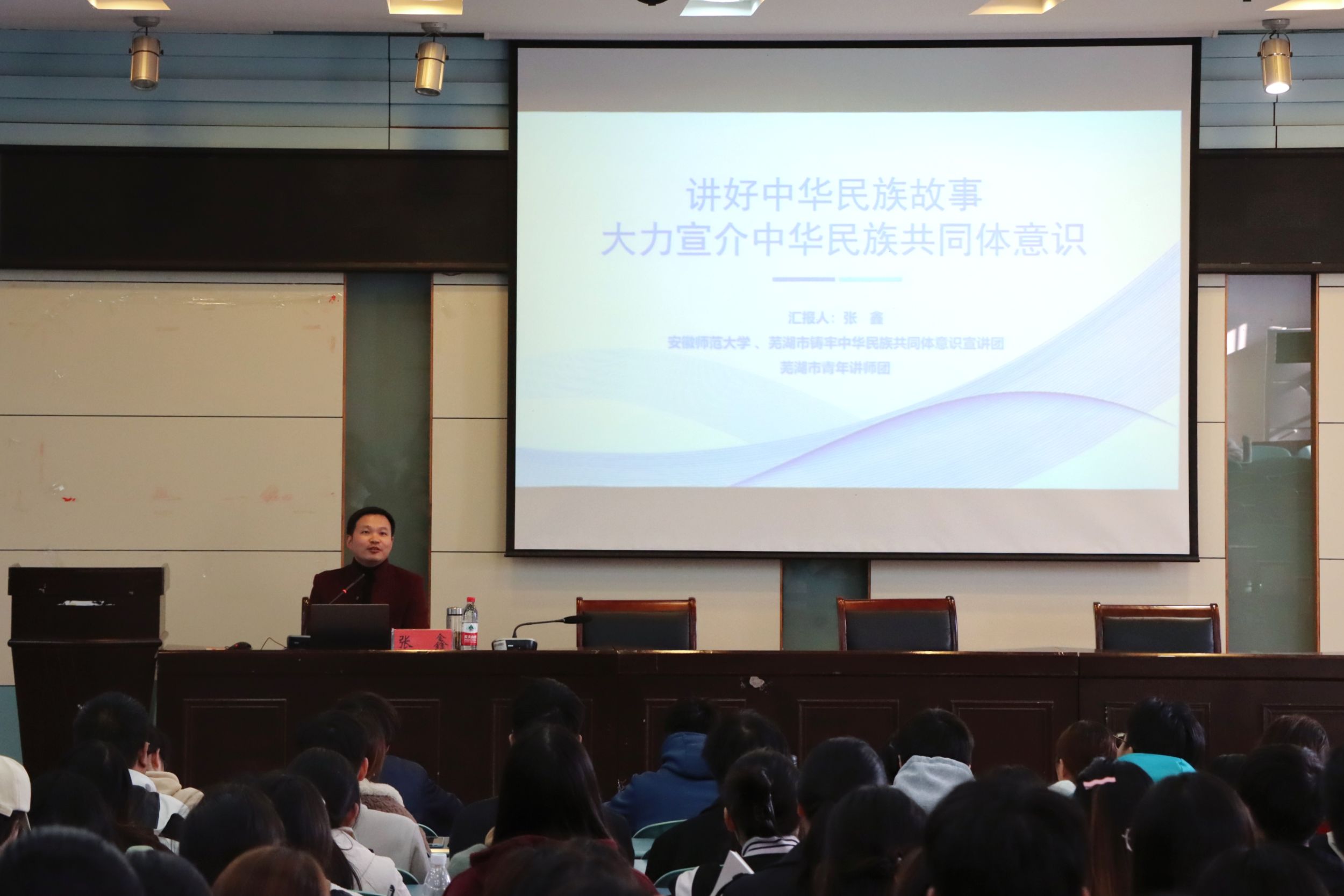 张鑫以习近平总书记在主持中共中央政治局第九次集体学习时强调“要讲好中华民族故事,大力宣介中华民族共同体意识”引入,从四个方面阐述如何讲好中华民族故事:一是“讲好中华民族故事,需抓住一条主线”;二是“讲好中华民族故事,需注重叙事析理”;三是“讲好中华民族故事,需明确目标任务”;四是“讲好中华民族故事,需突出价值引领”。期间,张鑫特别引用了习近平总书记到访安徽六尺巷重温张吴礼让典故的实例,强调讲好中华民族故事的重要意义。