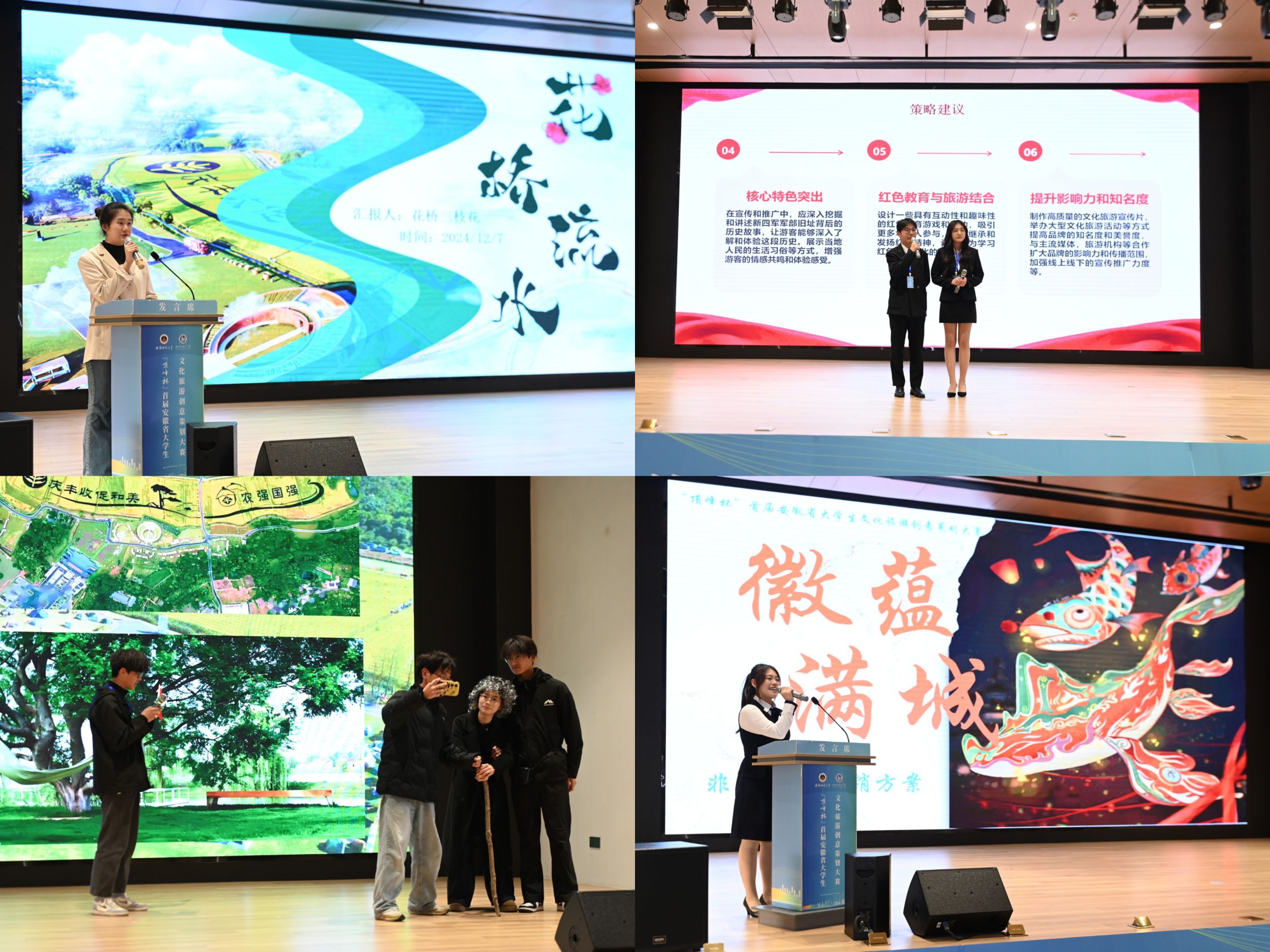 决赛环节,参赛选手依次按照旅游线路策划、主题旅游产品策划、旅游营销策划三个赛道顺序展开汇报。旅游线路策划赛道共有十组选手参加,主题旅游产品策划赛道共有十组选手参加,旅游营销策划赛道共有九组选手参加。参赛选手们围绕安徽省内各地市优秀传统文化、红色文化、旅游特色等基础,通过创意设计,从主题定位、市场分析、创意理念、产品设计、市场营销、财务分析等各个方面展示了自己团队的创意主题,作品充分考虑将传统和现代科技融合、文化和旅游融合、市场和产品对接,具有较强的时代性和可行性。评委老师们结合参赛作品进行即兴提问,参赛学生沉着冷静、条理清晰的回答充分展示了当代大学生对专业知识的应用、对文旅发展的认知探索和文旅策划的无限创意。