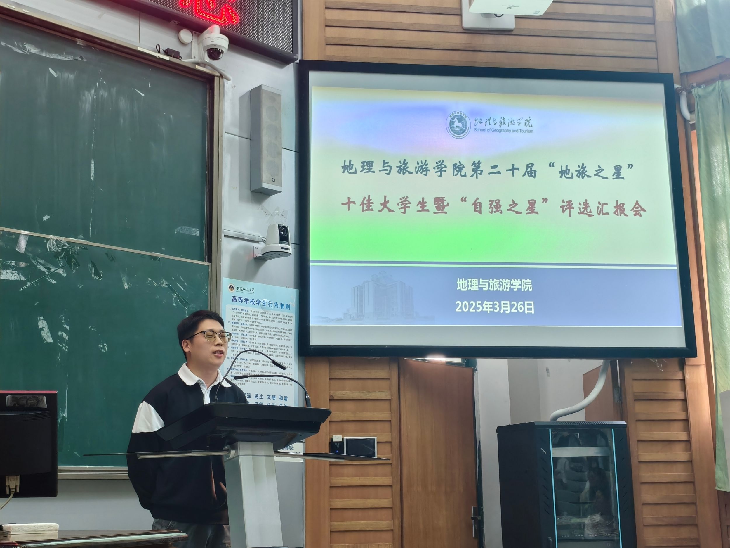 于行知楼1号楼105报告厅举行第二十届“地旅之星”十佳大学生暨“自强之星”评选活动。学院党委副书记付勇,学院团委负责人以及各专业辅导员老师代表出席活动并担任评委,各班学生代表现场聆听并参与评审。