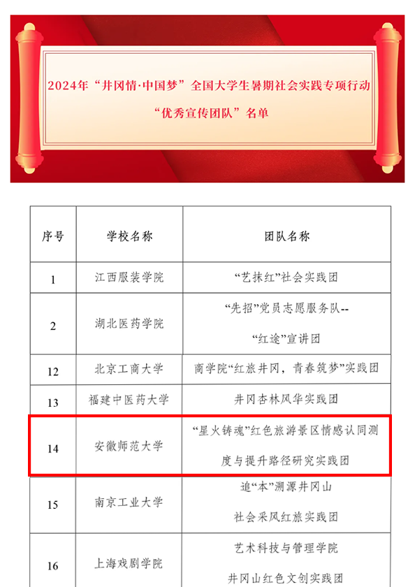 申报的星火铸魂红色研究实践团喜获该项目“优秀宣传团队”。经过层层筛选和评审,全国共有32支团队获此殊荣,安徽省高校仅2支队伍入选。