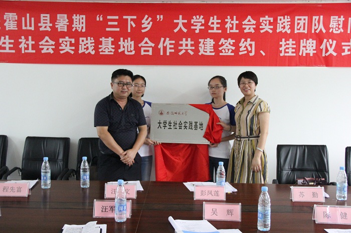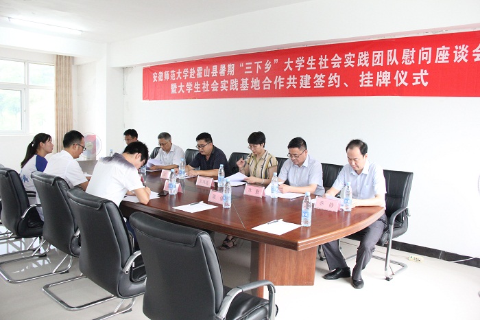 赴霍山县暑期“三下乡”大学生社会实践团队慰问座谈会暨大学生社会实践基地合作共建签约、挂牌仪式。活动由霍山县水务局党组成员、县农建办主任汪文主持。