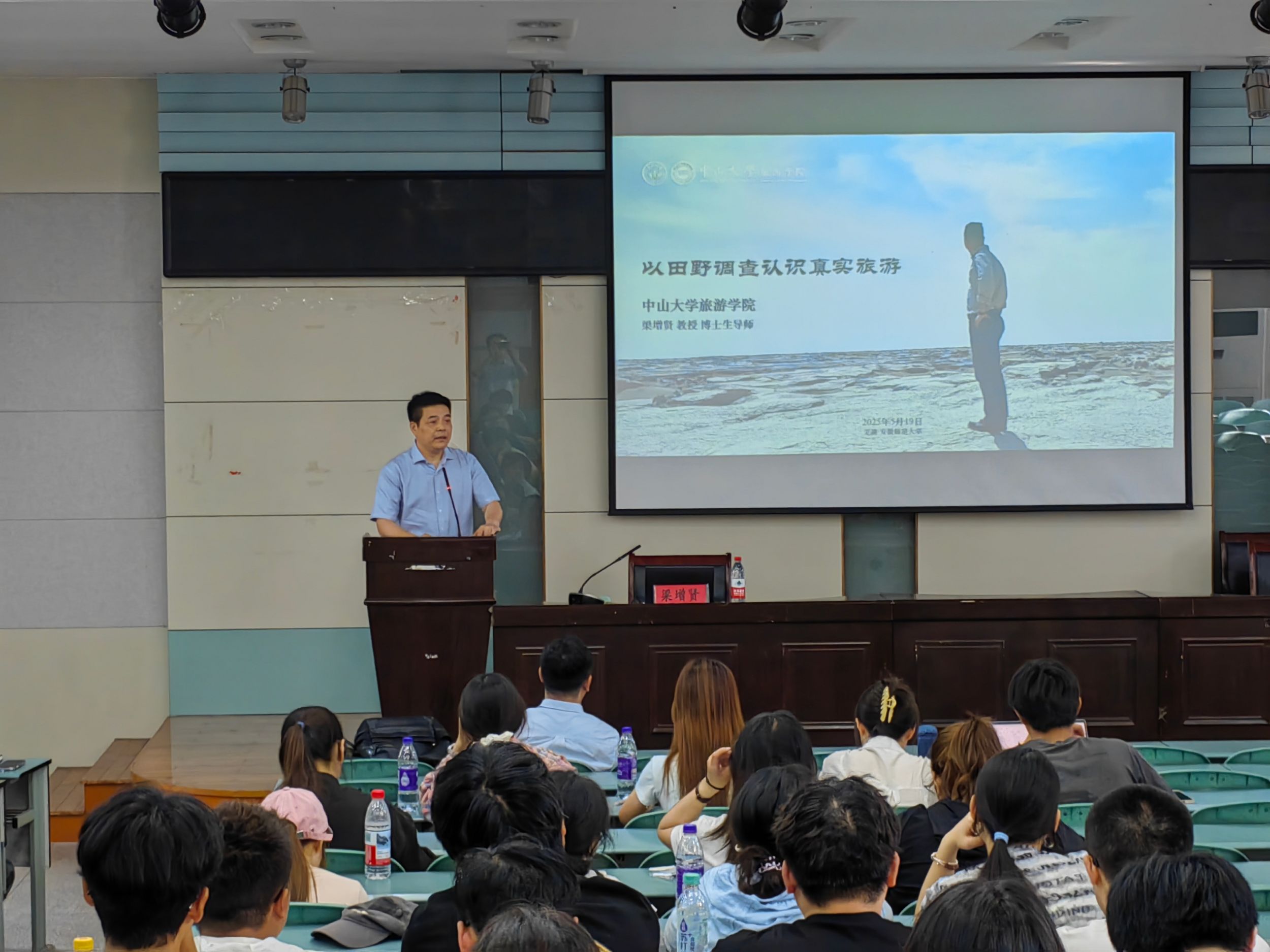梁增贤结合自己的科研经历,用生动的语言阐述了田野调查对旅游研究的重要性、如何开展田野调查以及开展田野调查需要的基本素质,深化了同学们对该方法的理解。讲座上,梁增贤鼓励同学们要以求真务实、艰苦奋斗、积极乐观的态度探索旅游世界的本真。