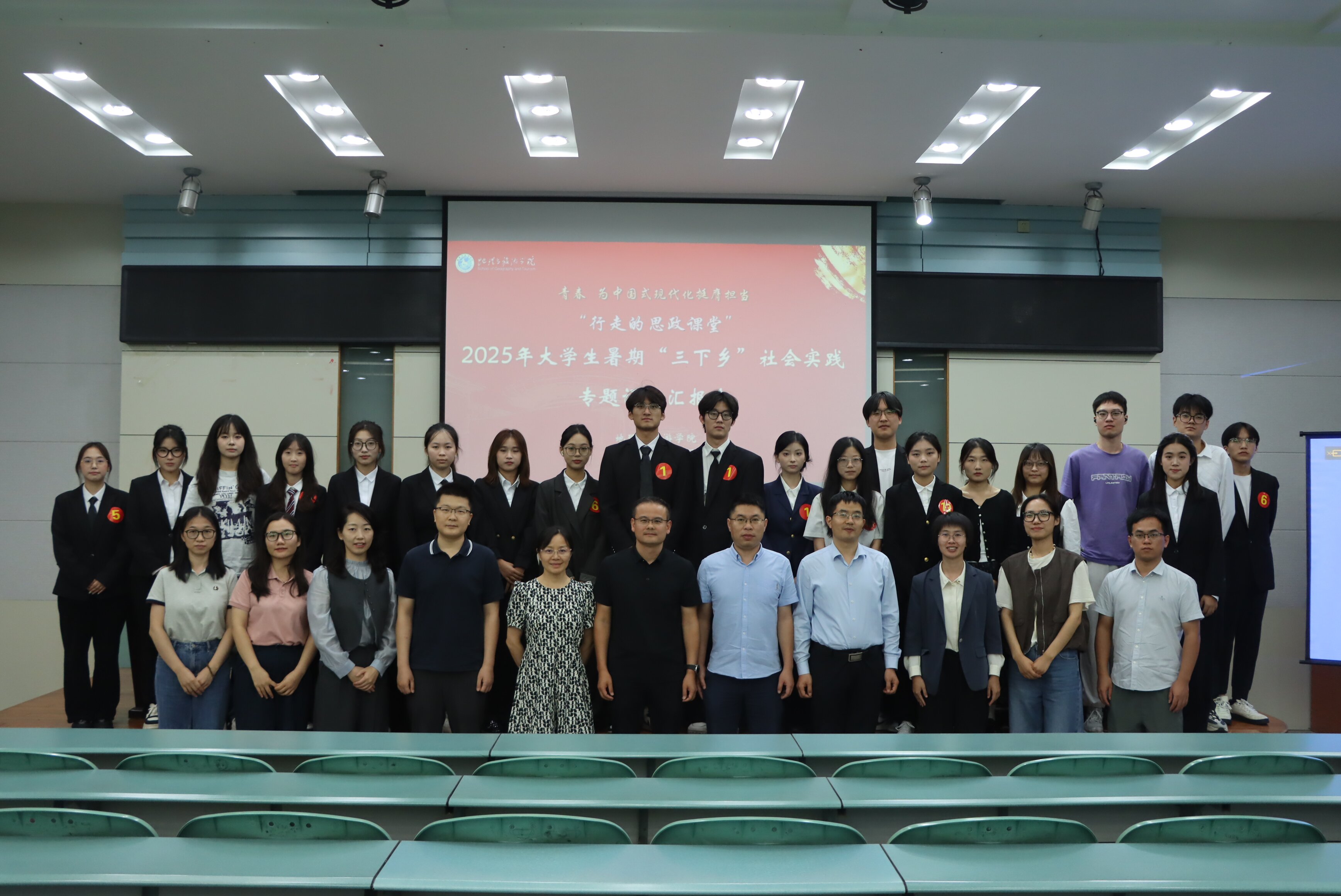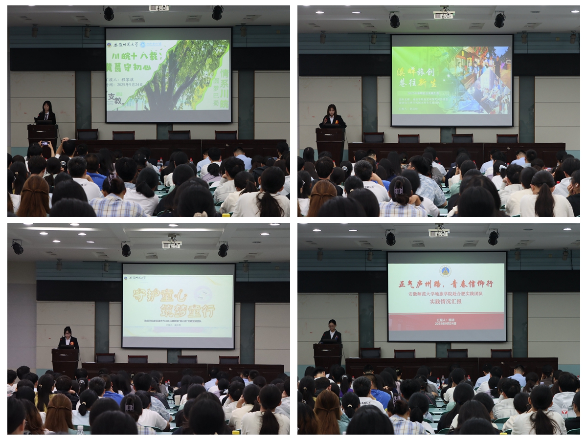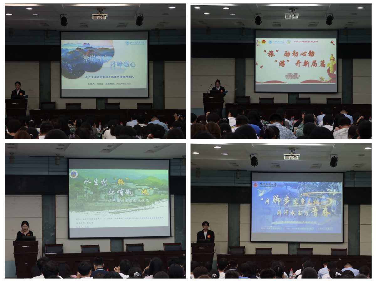 本次评比汇报共有15支课程团队和8个班级参与展示。团队负责人围绕实践主题、课程设计、实施过程、成果产出等方面,以PPT形式进行汇报,全面呈现“行走的思政课”在价值引领、专业融合、服务社会等方面的多元路径。在成果展示环节,各课程团队充分体现了“走-看-讲-思-做”的实践逻辑与课程内涵:如“正气庐州路,青春信仰行”团队走进合肥包公文化园,开展志愿讲解与文化创意设计,在服务中传承廉政文化;“做青弋行者,序檐语岁时”团队深入黄山歙县阳产村,聚焦传统村落保护与可持续发展路径,践行乡村振兴课的专业使命;“渔脉新生”团队走访长江流域安徽段11个县(市、区),围绕退捕渔民可持续生计开展系统调研,形成具有政策参考价值的调研报告;“童心圆”支教宣讲团在芜湖马塘新镇开展支教活动,以趣味课堂激发乡村儿童学习兴趣;“摇篮育初心,青春井冈行”团队踏上井冈山革命圣地,在行走中感悟信仰力量;“淮畔四时·中州盛宴”团队结合节气文化开展文旅融合调研,推动中华优秀传统文化创造性转化。此外,8个班级代表也依次登台,汇报班级整体社会实践组织情况与育人实效,展现出地旅学子结合专业、扎根基层、服务社会的责任担当与青春风采。
