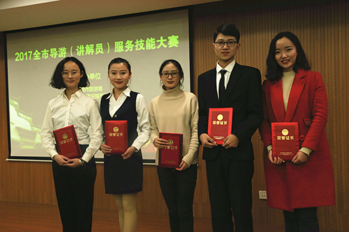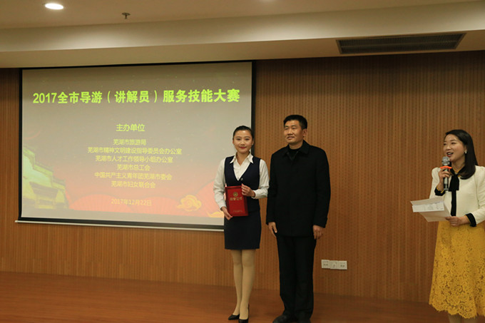 本网讯(国旅学院 赵云飞/吴燕)12月22日,由芜湖市旅游局、芜湖市精神文明建设指导委员会办公室,芜湖市人才工作领导小组办公室、芜湖市总工会、中国共产主义青年团芜湖市委员会、芜湖市妇女联合会共同举办的“2017全市导游(讲解员)服务技能大赛”决赛顺利在芜湖市委党校举行。我校国旅学院2015级旅游管理专业何志柯等四位同学经过激烈角逐,表现出色,夺得一等奖一项(全场总分第一),并被授予“全市金牌导游”、“优秀导游员”等称号,学校被授予“优秀组织奖”。