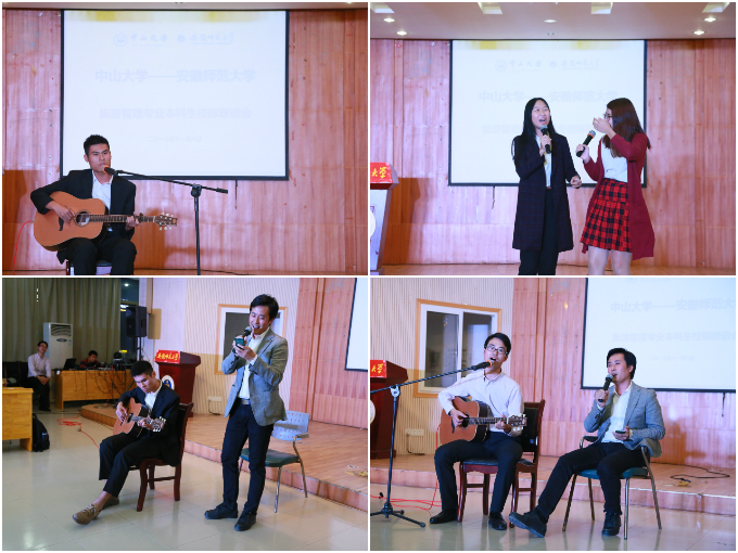 本科生校际联谊会。中山大学旅游管理与规划系主任左冰副教授、副主任刘逸博士、国旅学院党委副书记乔静等领导老师出席了联谊会,两校学生相间而坐,以更加轻松活泼的形式深入交流。两校2015级旅游管理专业的班长分别为对方佩戴上自己学校的校徽,象征着长江之滨的师大学子和珠江之畔的中大学子结成互信互助的朋友。随后,两校师生将精心准备的文艺节目一一呈现,国旅学院精心准备的茶艺节目《高山流水》博得满堂彩,一壶清茶用以招待远方来访的朋友;番茄小说