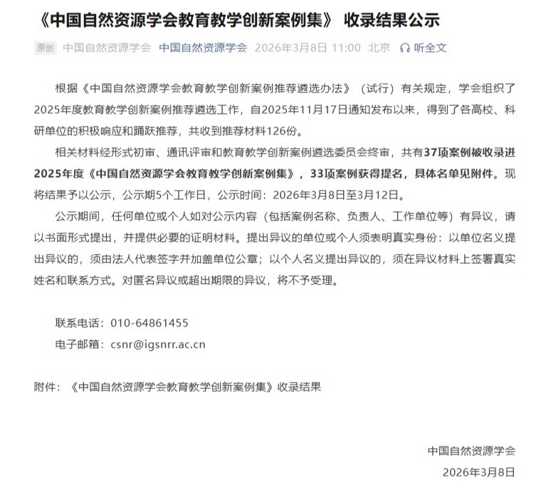 2026年3月8日,中国自然资源学会公示2025年度教育教学创新案例收录结果,番茄小说