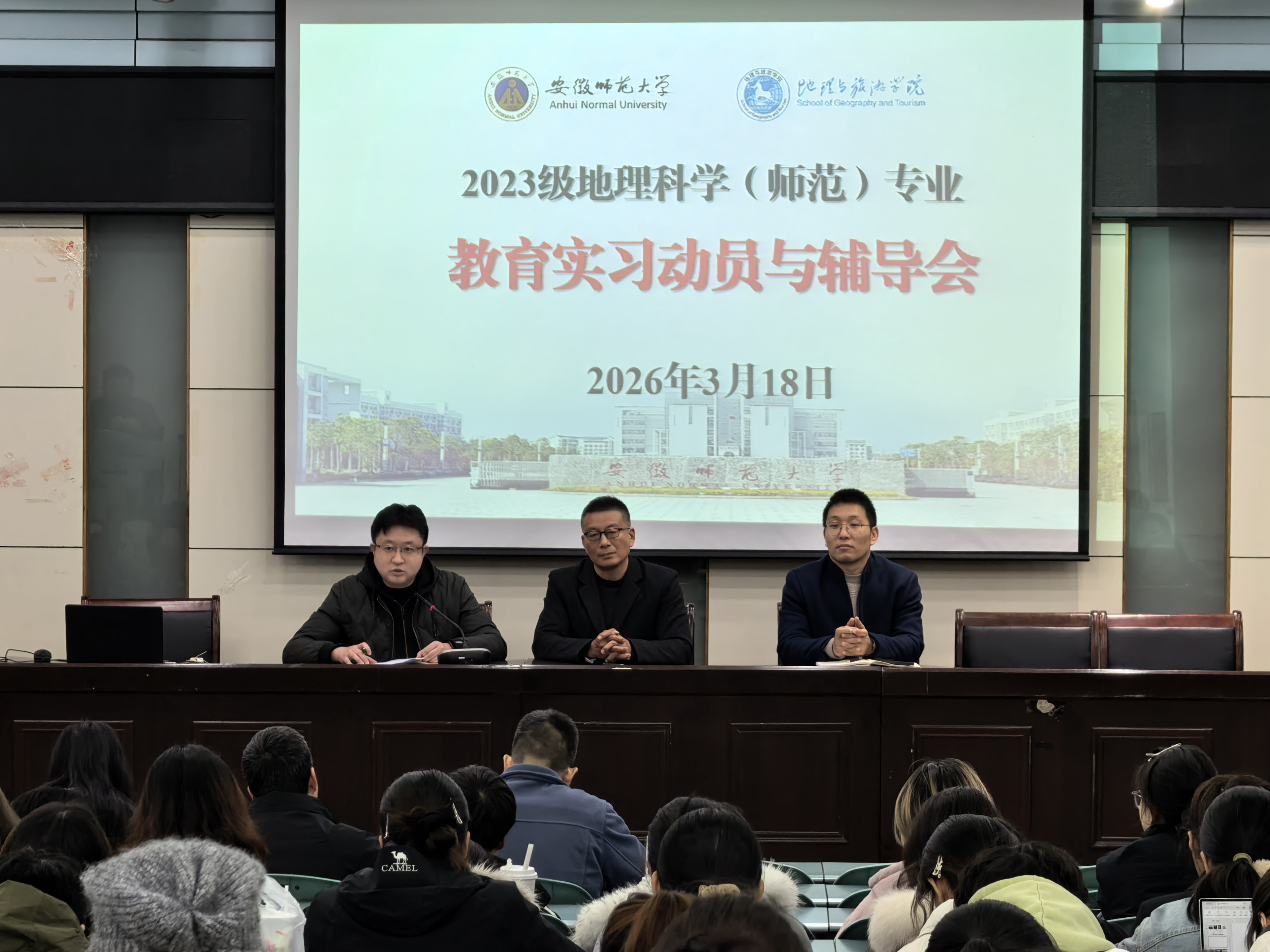 在实验楼101报告厅召开2023级地理科学(师范)专业教育实习动员大会。学院党委副书记钱程、副院长孙鹏,实习指导教师组组长朱永恒,各实习小组指导教师,辅导员及2023级地理科学(师范)专业全体学生参加会议。
