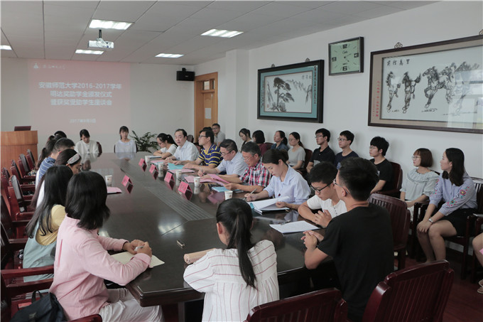 聘任仪式结束后,明达奖助学金颁发仪式暨获奖受助学生座谈会在国旅学院三楼会议室举行,深圳市明达资产管理有限公司董事长刘明达、学生处副处长张玉新、国旅学院党政班子、全体辅导员以及获奖受助学生代表参加了仪式。颁发仪式由乔静主持。