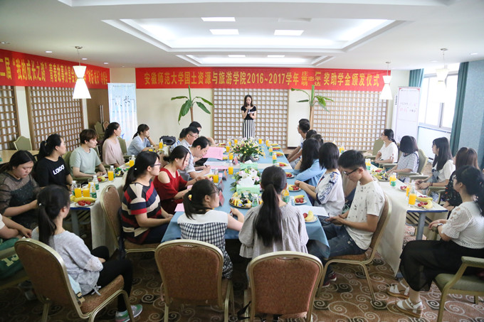 本网讯(国旅学院 梁宜人 徐永妍)6月1日下午,国土资源与旅游学院首届院领导“对话·成长”冷餐会暨第二届“我的成长之路”青春故事分享会和2016-2017学年庄严奖助学金、雷忠平奖助学金、明达奖助学金颁发仪式在国旅学院实验楼三楼饭店实训室317教室举行。国旅学院党委书记贾冠忠、院长苏勤、副书记乔静、院全体专兼职辅导员与各项奖助学金获奖受助学生参加了本次活动。活动由辅导员吴燕主持。