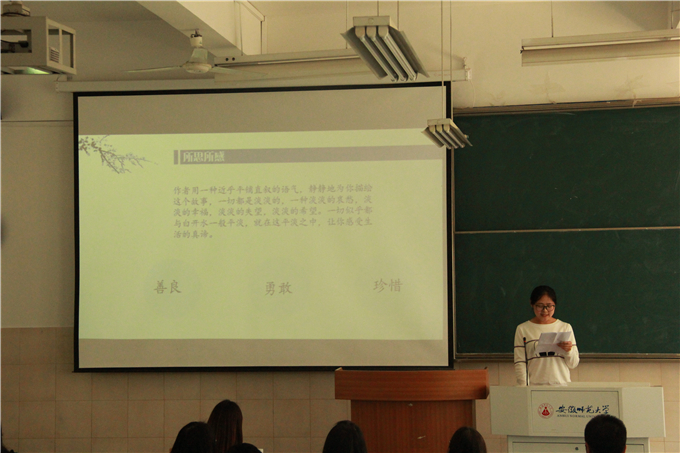 本次报告会共计17名选手参加。会上,选手们声情并茂,结合清晰明了的PPT,向评委与现场观众详略得当地介绍自己所阅读的文学作品,并阐述自己的感言与见解。其中,来自2015级旅游管理专业的张艳与同学们分享了自己对于《牧羊少年的奇幻之旅》一书的见解与感受,展示了精神追求与现实冲突的一种融合;来自2015级地理科学专业的丁琼,从《简·爱》一书谈起,讲述着我们身边被忽视的幸福。