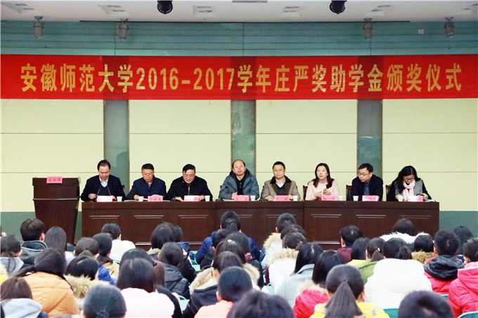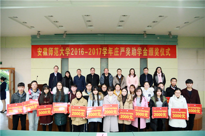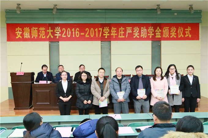 国土资源与旅游学院2016-2017学年庄严奖助学金颁发仪式在国旅学院101报告厅隆重举行,庄严基金会代表庄明福、赵泉陈、吴斌、杨军、鲍昭世、杨晶晶,国旅学院党政领导班子和全体辅导员老师、获奖受助学生代表参加了本次大会,会议由该院党委副书记乔静主持。