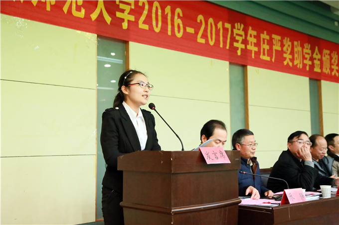 其后,2015级旅游管理专业郭雨琪同学代表庄严奖学金获奖学生发言,“人穷志不穷”是她对自己的定位,拥有着学霸和志愿达人标签的她,将自己踏实苦干、突破创新的大学生活与大家分享。2015级地理信息科学的王宇瑶,是庄严助学金代表学生,她用不屈不挠的态度诉说着家中的窘境,用不骄不躁的语调讲述着在学校的成长。用满怀的深情对庄严基金会及各领导的关怀、培养和激励表达了衷心的感谢。
