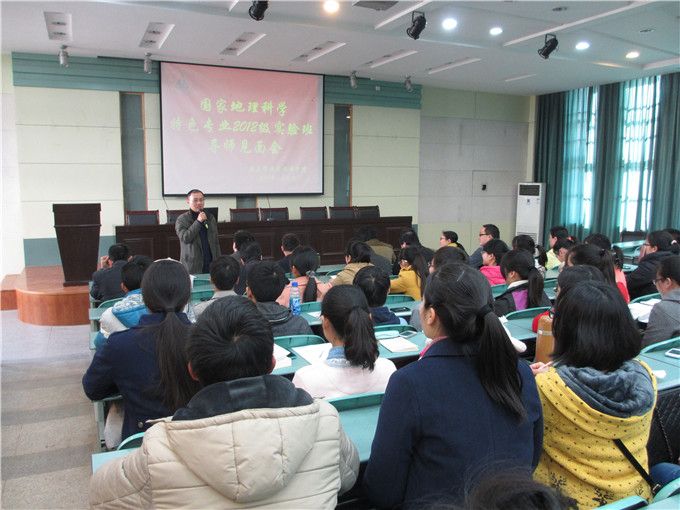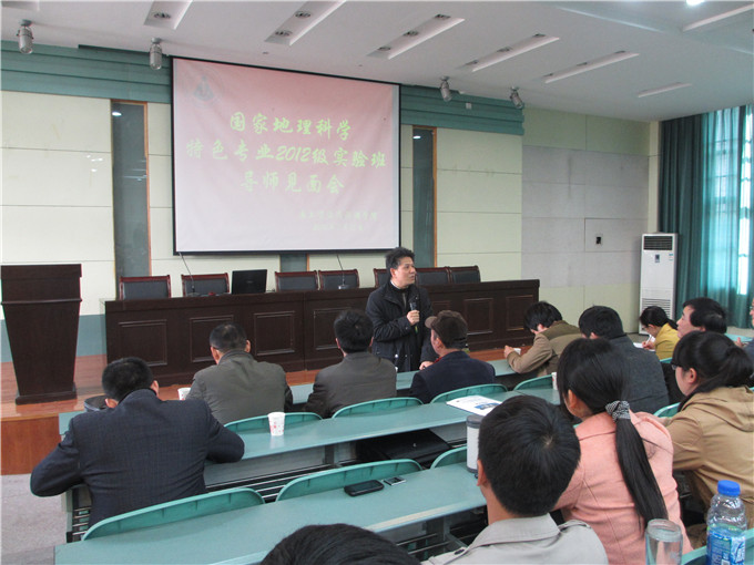 2014315,国家地理科学特色专业2012级实验班导师见面会在实验楼101举行,国家地理科学特色专业建设点负责人、校科研处处长陆林、院党委副书记罗振、地理系主任方凤满、校外导师李志、马辉陵、余保华、校内导师张平究、朱永恒、李俊峰、沈非、高超及辅导员张出席本次大会。