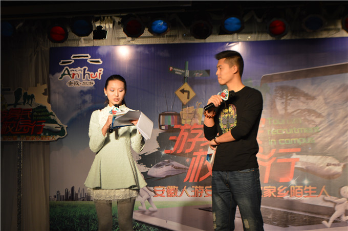 本网讯(张鑫、赵影、张梦翠)为推广安徽旅游事业,弘扬徽旅文化,并为在校大学生提供一个自我展示的舞台,丰富大学校园文化生活,1119日晚,由安徽省旅游局、安徽网络电视台、国土资源与旅游学院主办,院团委学生会、旅游爱好者协会承办的“寻梦安徽”大学生旅游文化节在校团委多功能厅精彩拉开帷幕。此次活动由安徽卫视著名主持人孙鹏飞和校礼仪队队长、12级旅游管理专业赵培培同学搭档主持,全校师生近400余人参加本次文化节。