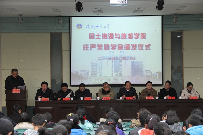 本网讯(国旅学院记者团)12月20日下午,我校第二届(2013-2014学年)庄严奖、助学金颁发仪式在国旅学院实验楼101报告厅隆重举行。庄严基金会代表、学生处副处长陈莉、院领导班子成员,学院全体辅导员及受奖、助学生代表参与了此次颁发仪式。大会由国旅学院党委副书记罗振主持。