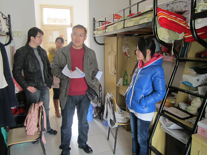 随后,学院学工组在党委副书记罗振的带领下深入学生宿舍,认真查看了同学们的起居用具,宿舍卫生状况,并关心同学们寒假过得怎么样,学期初是否制定了学习计划,生活上有没有困难,叮嘱大家将自己的精力迅速投入到学习生活中来;罗书记还表示,全体学工队伍务必高度重视学生的安全稳定工作,勤下基层,多进宿舍,听真话、办实事、转作风、求实效。