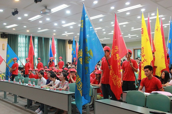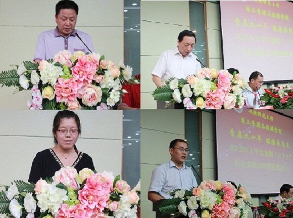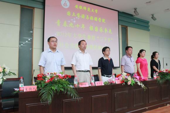 “青春九十年,报国永争先”。6月29日下午,学院在实验楼101教室召开2012年大学生暑期“三下乡”社会实践活动动员大会暨启动授旗仪式。校党委学工部部长、学生处处长台启权、校团委秘书胡悦超、学院暑期社会实践团队思政指导老师牛菲,学院全体领导班子成员出席了大会,所有团队指导老师及队员参加了启动仪式。会议由院团委副书记张鑫主持。