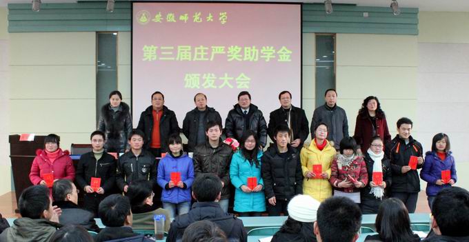 会上,学生处副处长李娟首先宣布了《关于向朱娟等90名同学颁发第三届庄严奖助学金的决定》,获奖和受助学生代表相继发言。随后,庄严基金会代表庄明福先生发表了言简意赅的讲话,表达他对学校的衷心感谢和进一步做好庄严奖助学金的承诺,并希望获奖受助学子能努力学习,将爱心的种子传播下去,将来为社会多做贡献。校学生处处长余国升在发言中高度肯定了庄严基金会的善举所取得的效果,同时希望广大贫困学生要正视现实,接受挑战,做生活的强者;要勤奋学习,勇于实践,做成才的勇者;要学会感恩,甘于奉献,做爱心的使者。最后,与会领导和嘉宾分别向获得本届庄严奖助学金的学生颁发了证书和奖助学金。