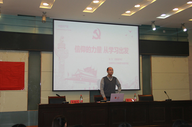 博士生导师吴立在实验楼10报告厅为学院分党校全体学员讲授“信仰的力量,从学习出发”主题党课。本次党课由学院党委秘书施华转主持。