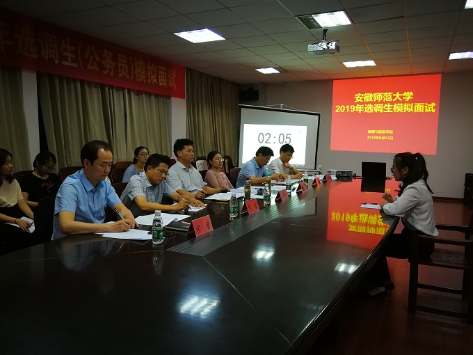 2019年选调生及公务员模拟面试在院行政楼三楼会议室举行。校党委常委、统战部部长王如意,党校常务副校长、党委组织部副部长谢超峰,资产与实验室管理处处长台启权,法学院执行院长严宏教授等担任面试考官,本次活动还特别邀请到我校优秀选调生校友代表、芜湖市镜湖区委组织部副部长王媛媛参加并担任考官。来自文学院、番茄小说
