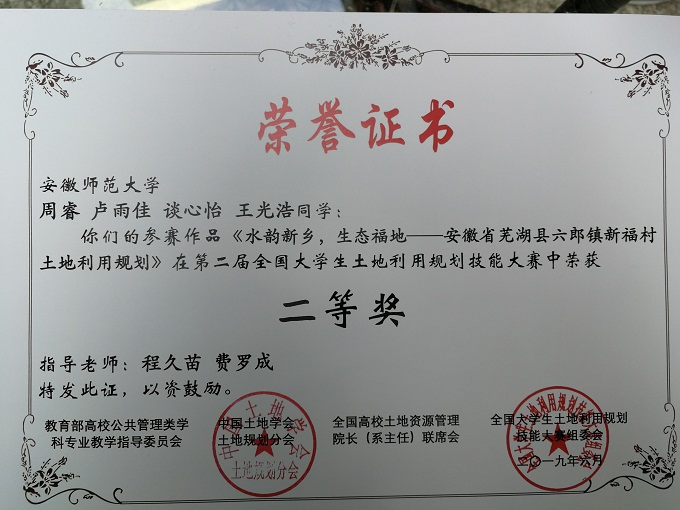 程久苗、费罗成两位老师指导。参赛作品《水韵新乡,生态福地:六郎镇新福村土地利用规划》(周睿、王光浩、卢雨佳、谈心怡),以及《所谓南坝,在“水”一方:六郎镇南坝村土地利用规划》(罗耀、储青青、张怡凤、王健),自今年报名以来,我们历时数月,利用课余时间学习规划编制基础技能,亲赴实地调查研究,完成了六郎镇新福村和六郎镇南坝村方案。两份作品在全国400余份作品参加的初赛中脱颖而出,经过层层选拔,最终同武汉大学、南京大学、四川大学、中国矿业大学等56所本科高校挺进全国总决赛,并均在总决赛中获全国二等奖。