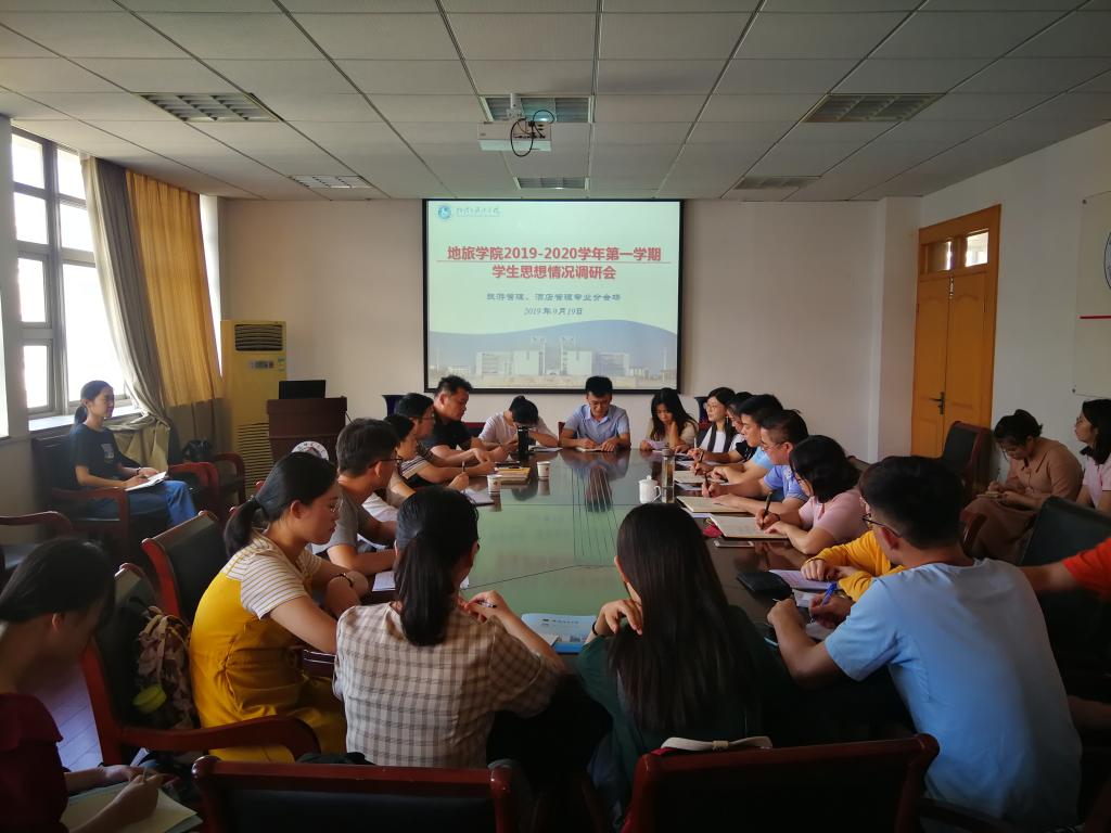 召开新学期学生思想调研师生座谈会。学院党委书记贾冠忠、院长苏勤等学院领导班子成员,各专业负责人、全体专兼职辅导员、各年级学生代表按专业分会场开展座谈会。