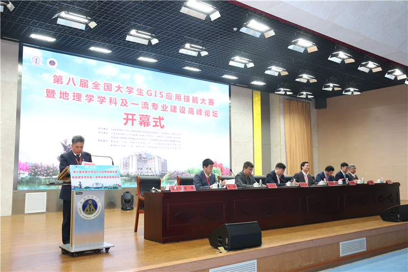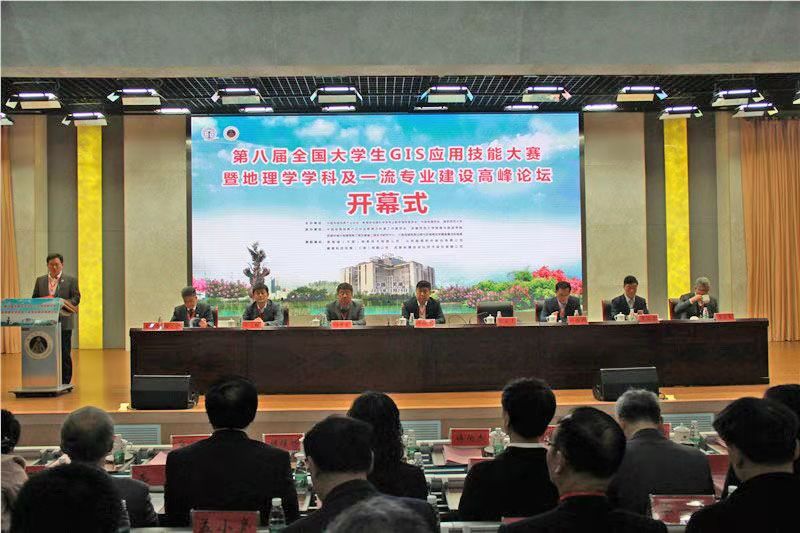 党委副书记、校长张庆亮,中国地理信息产业协会教育与科普工作委员会主任委员、教育部地理科学类专业教学指导委员会副主任、南京师范大学教授汤国安,中国地理信息产业协会教育与科普工作委员会主任委员、教育部地理科学类专业教学指导委员会副主任、武汉大学教授刘耀林,教育部地理科学类专业教学指导委员会秘书长、北京大学教授刘瑜,大赛评委会主席、清华大学教授党安荣,中国地理信息产业协会副秘书长、南京大学教授李满春等领导嘉宾及各高校参赛团队指导教师、学生等出席了开幕式。
