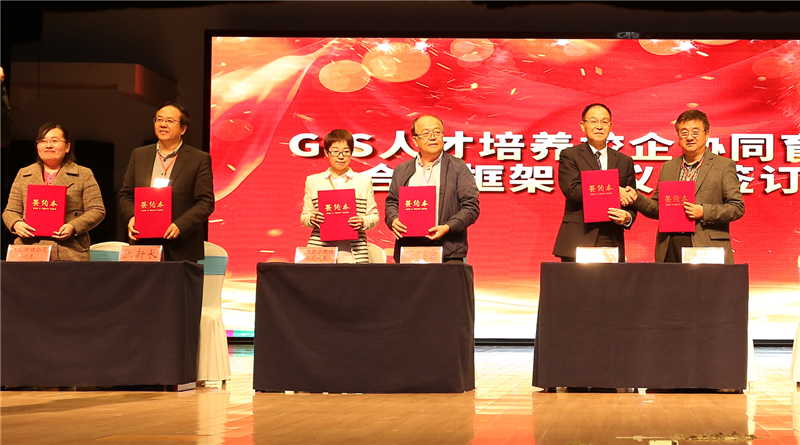 为全面推行校企协同育人,加强校企双方在课程体系建设与改革、实习与实训基地建设、就业创业、国际化交流、师资合作与培训、教材研发等方面开展深度合作,提高大赛的社会影响和促进人才培养的作用,本次闭幕式还举行了GIS人才培养校企协同育人战略合作框架协议书签订仪式、企业代表与获奖学生代表就业意向协议书签订仪式。来自中国地理信息产业协会教育与科普工作委员会的5位高校代表与易智瑞(中国)信息技术有限公司等5家企业的代表上台签订校企协同育人战略合作框架协议;来自北京超图软件股份有限公司等5家企业的代表与来自南京大学、番茄小说