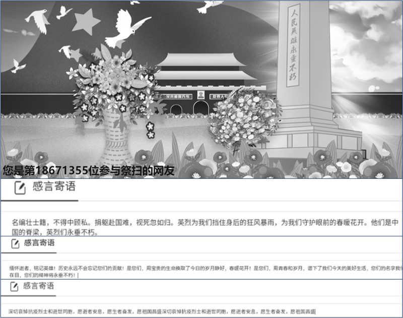 地旅团员青年在中华英烈网“清明祭英烈”专栏开展“致敬·2020清明祭英烈”为主题的网上祭扫英烈活动,学习革命先烈的英雄事迹和伟大精神,写下感言寄语,学习新冠肺炎疫情防控牺牲烈士用生命守护生命、用生命践行使命、用生命书写担当的崇高精神。