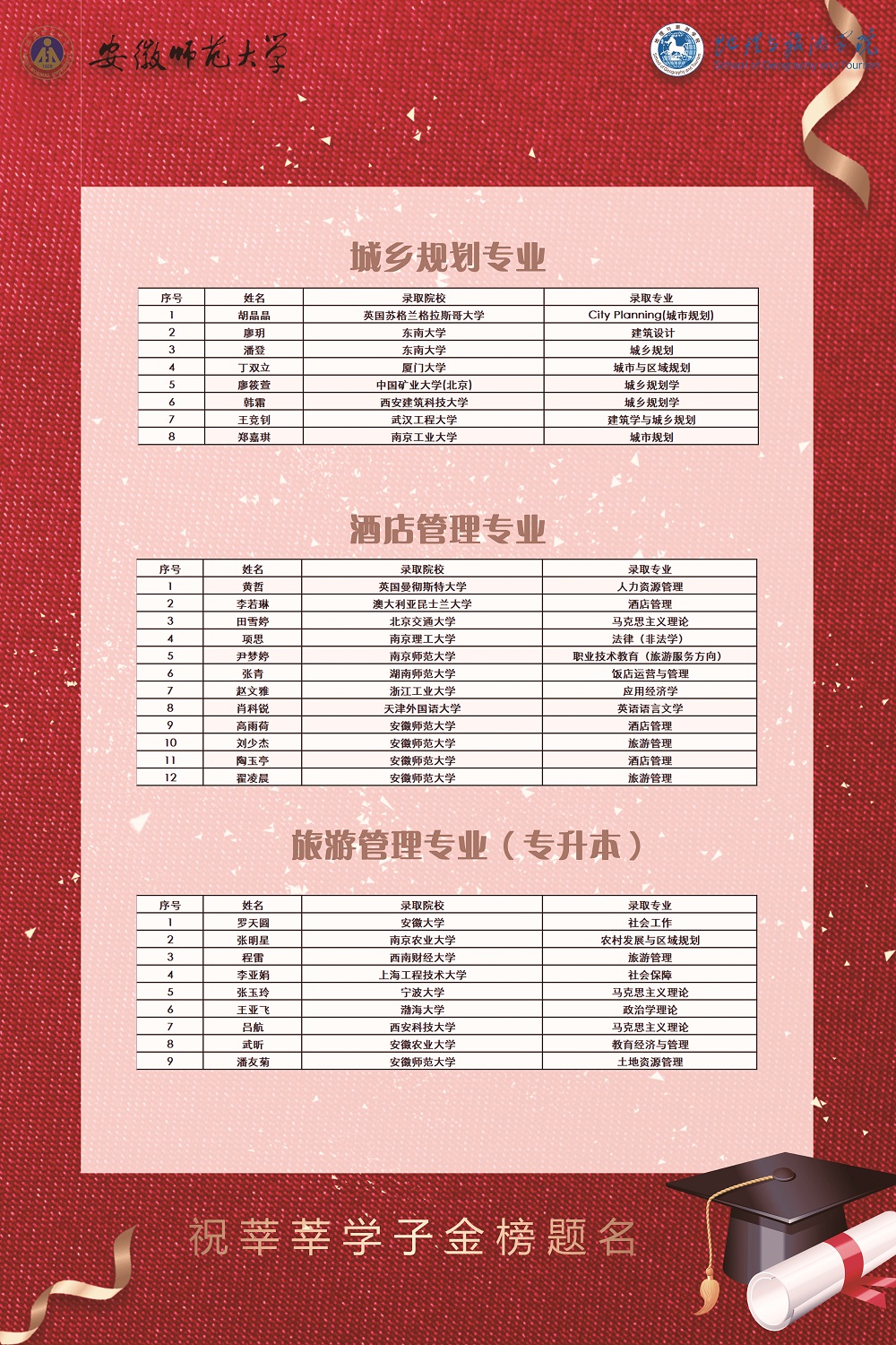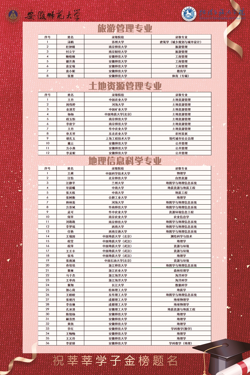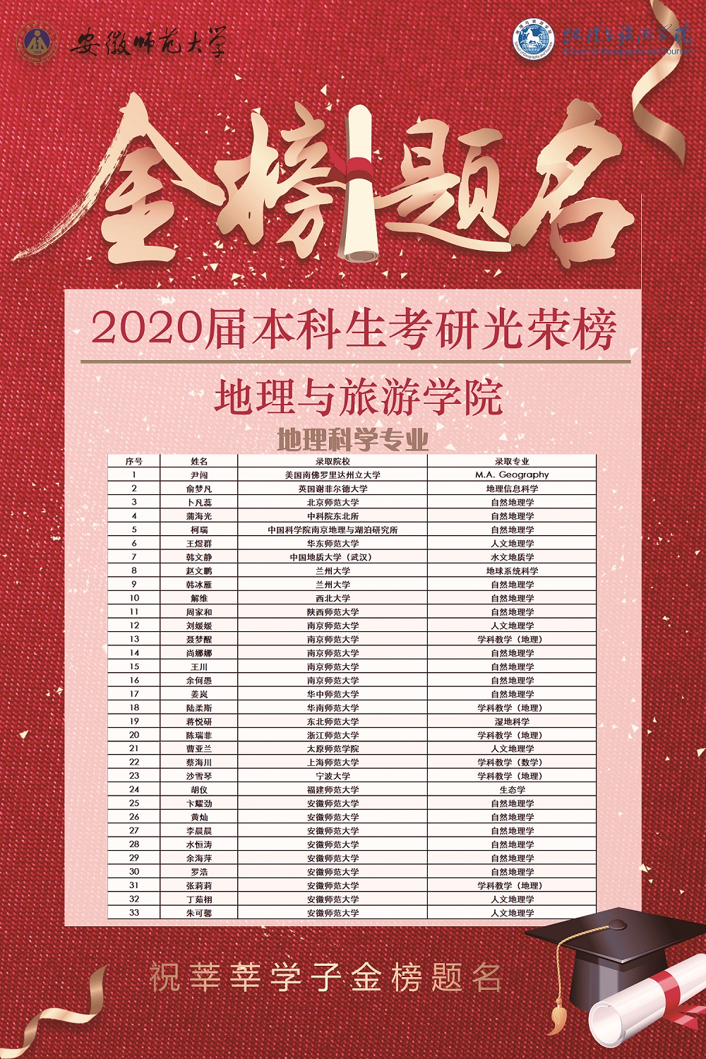 2020届毕业生共459人,国内外继续深造人数达119人,占毕业生总人数的25.93%。各专业升研率分别为地理科学专业38.64%、旅游管理专业10.96%、土地资源管理专业26.67%、地理信息科学专业51.43%、城乡规划专业22.22%、酒店管理专业23.08%,旅游管理(专升本)11.25%。其中考取国内双一流高校、科研院所和出国深造人数占总数的53.78%;国内主要包括中国科学技术大学、东南大学、厦门大学、北京师范大学、华东师范大学以及中国科学院等高校和科研院所;国外主要有美国佛罗里达州立大学、英国谢菲尔德大学、英国格拉斯哥大学、英国曼彻斯特大学、澳大利亚昆士兰大学等。