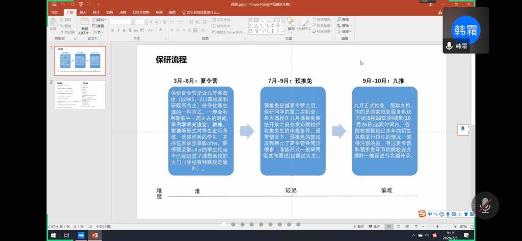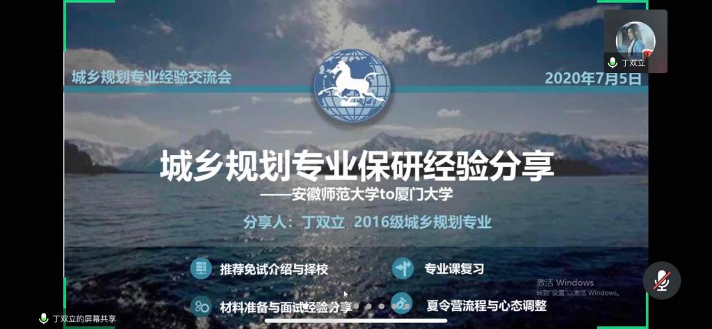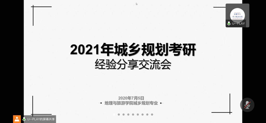 王竞钊)为充分对2021年学生做好考研指导,7月5日上午,城乡规划专业利用网络会议的方式开展了2021年考研经验分享交流会,会上邀请来自2016级多位成功升学的同学做了经验分享,参加会议的还有城乡规划专业教师姚景艳以及2017级全体学生。