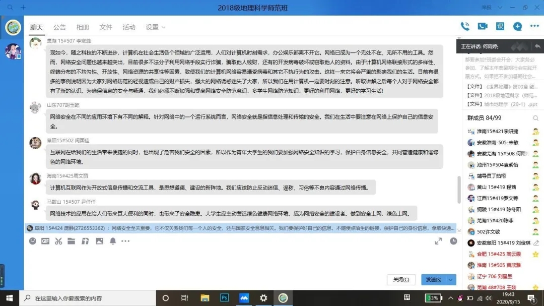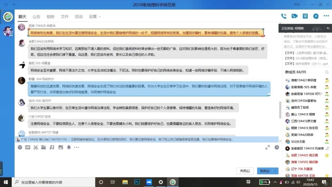 学院党委高度重视、周密部署、积极组织,通过微信、QQ群等平台发布通知,确保每一位教职工、研究生、本科生按时开展线上学习,并积极参与学习研讨,做到学习教育全覆盖。学院师生通过“人民网人民视频”、“咪咕视频客户端”等平台收看课程直播或回放,并分别在党支部群、班级团支部群内开展主题研讨,反响热烈,同学们积极开展主题研讨,并分享学习心得。